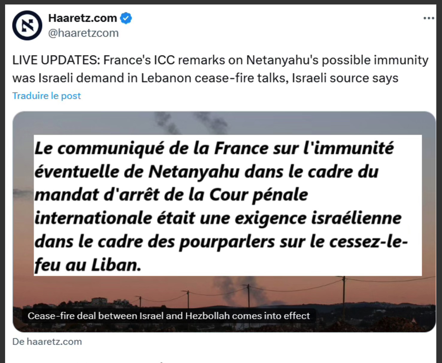 Le prétendu cessez-le-feu n’a été qu’une opération de communication des Etats-Unis et d’Israel, ce dernier ayant offert un strapontin à la France en échange de quoi Macron a renoncé à endosser les poursuites de la CPI contre Netanyahou. Le gouvernement libanais a été roulé dans la farine, plusieurs de ses soldats ayant été assassinés par les SS (soldats sionistes).
