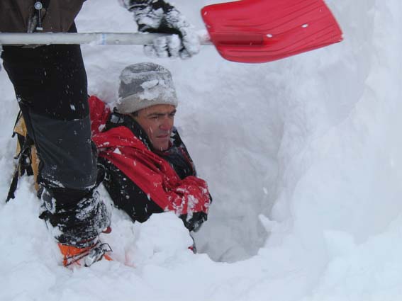 Sous la pelle apparait un bout d’étoffe grise. Je tapote l’étoffe : "c’est le bonnet, c’est la tête" Nous la dégageons. Serge émet un râle, on voit même un clignement de cils, mais il est toujours inconscient. Il n’a pas du être noyé, son nez et sa bouche n’ont pas été encombrés grâce à sa paire de lunettes qui a glissé et lui a fourni une protection parfaite des voies aériennes. Par expérience je sais qu’il faut continuer de le dégager. Les copains qui m’avaient sauvé au col des Marches en 1990 (Didier Paulmier et Bernard Poulain) étaient formels "t’as repris connaissance dès qu’on t’a libéré le thorax". Et c’est mot pour mot ce qui se produit sous nos yeux avec Serge.