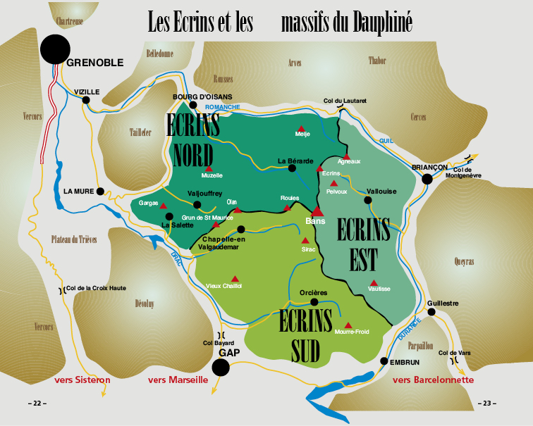 – ENO comprend les groupes : Beaumont, Rochail-Olan, Bans-Ailefroide, Meije-Ecrins, Agneaux-Grande Ruine au départ des vallées entourant ou traversant la partie nord du massif.