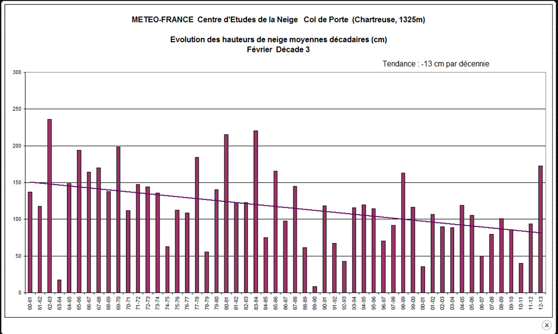 Ce jour la hauteur de neige au col de Porte mesurée dans la prairie (orientation nord) du centre d’étude la neige (CEN) à 1320 est de 5 cm. En zone moins favorable et sans intervention humaine elle est proche de zéro.