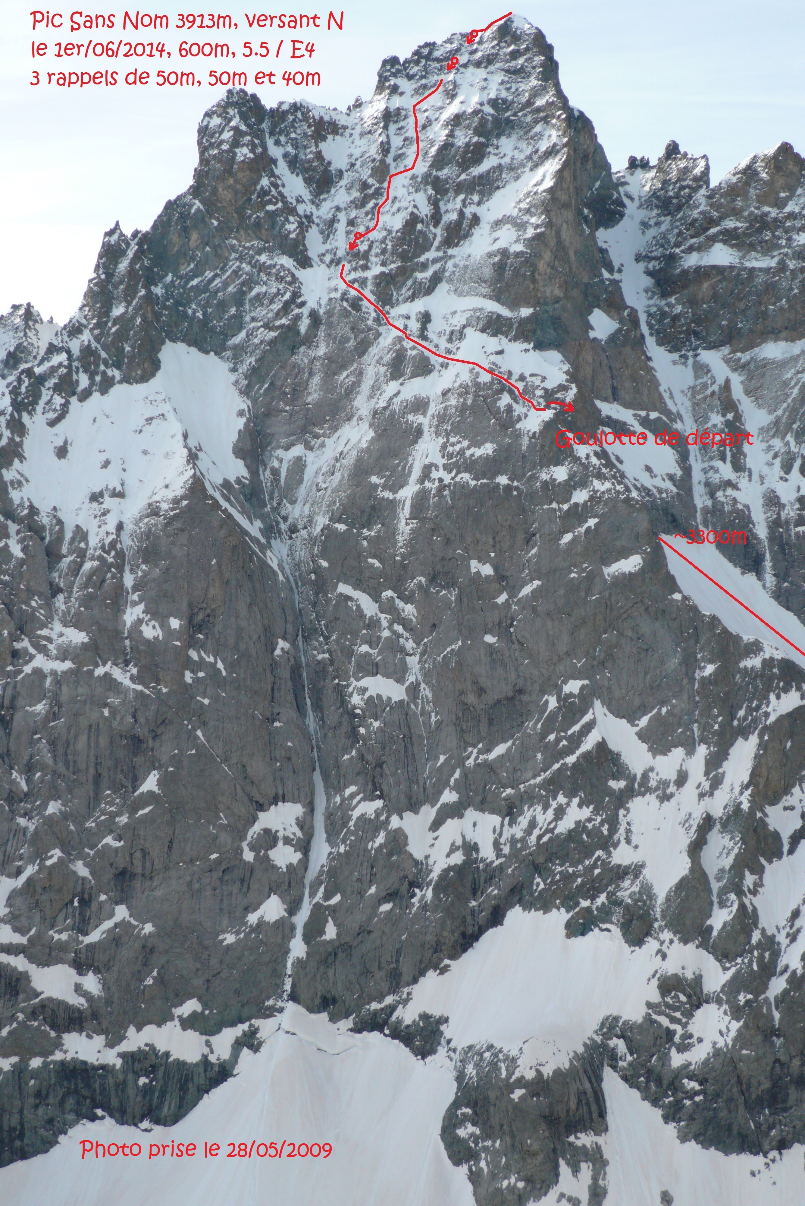 Hervé nous apprend qu’il a remonté puis descendu la ligne en suivant "au millimètre" ses traces de montée tant l’entreprise était raide, exposée et engagée. Du sommet, cela se résume en quelques virages versant sud afin de gagner une brèche un peu sous le sommet donnant accès à la face nord. Puis la partie sommitale qui commence par deux rappels, la traversée au-dessus des voies "classiques" (George-Russemberger, raie des fesses, Cambon-Francou, Farges-Fine...) et une goulotte skiable orientée ouest donnant accès au cirque sous le couloir nord-ouest. Hervé propose la cotation 5.5 en annonçant une pente supérieure à celle de la face nord de l’Ailefroide.