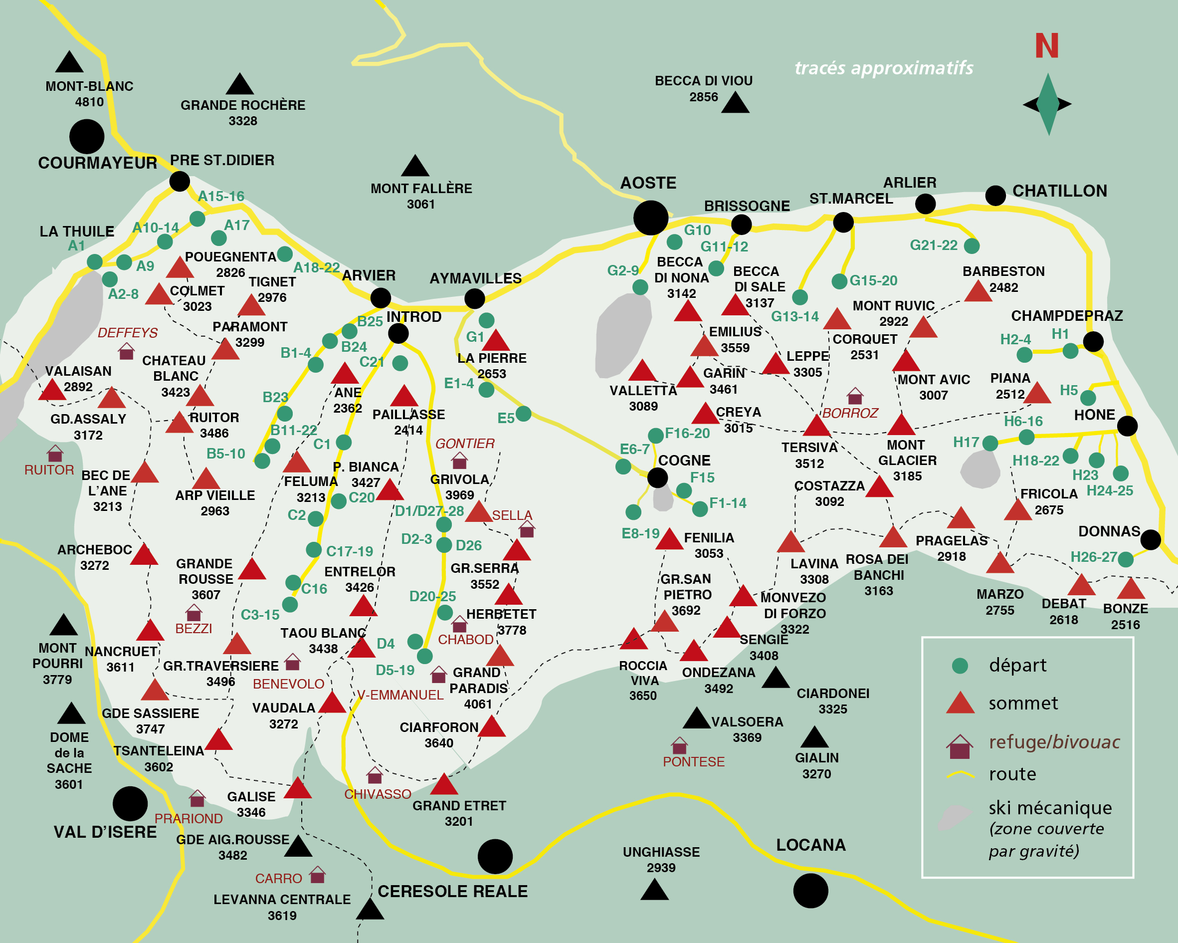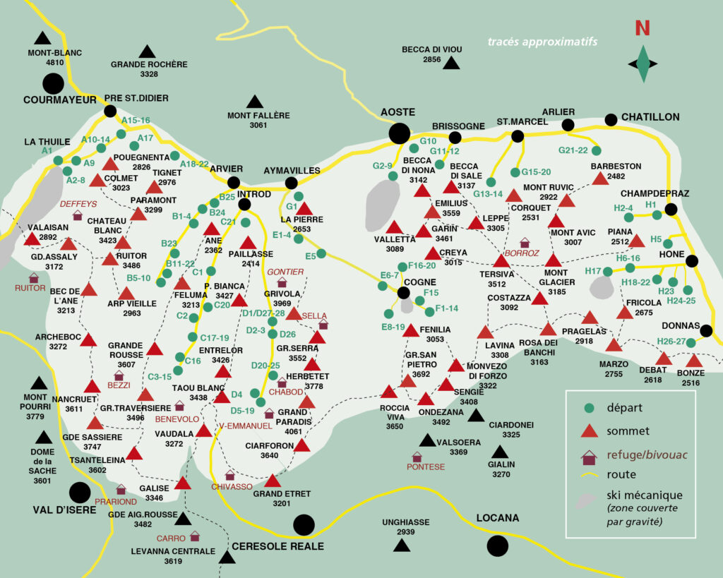 GPA est le massif du Grand Paradis situé sur la rive droite du Val d’Aoste. Entre la Thuile et Pont-Saint-Martin il comprend les groupes de montagne du Ruitor, Grande Sassière, Galise, Grand-Paradis, Grivola, Tersiva, Emilius et Mont Glacier.