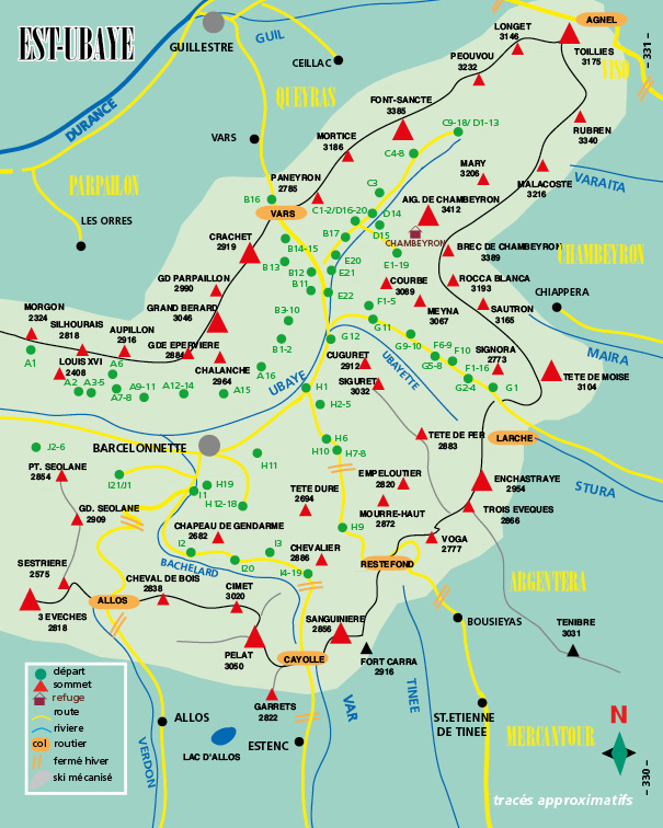Principaux groupes : Morgon, Grand Bérard, Parpaillon, Mortice, Font-Sancte, Toillies, Rubren, Chambeyron, Sautron, Moïse, Enchastraye, Siguret, Restefond, Sanguinière, Pelat, Seolane, Estrop, Blayeul, Monges. Un chapitre Hautes-Routes permet de découvrir confortablement les vallées de l’Ubaye et des massifs voisins.