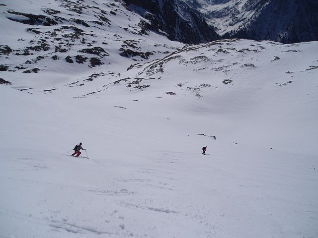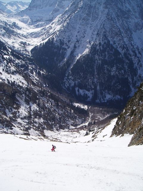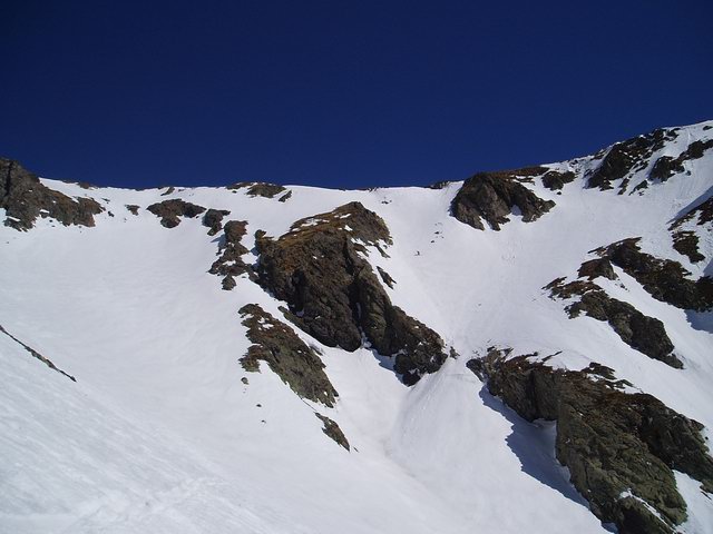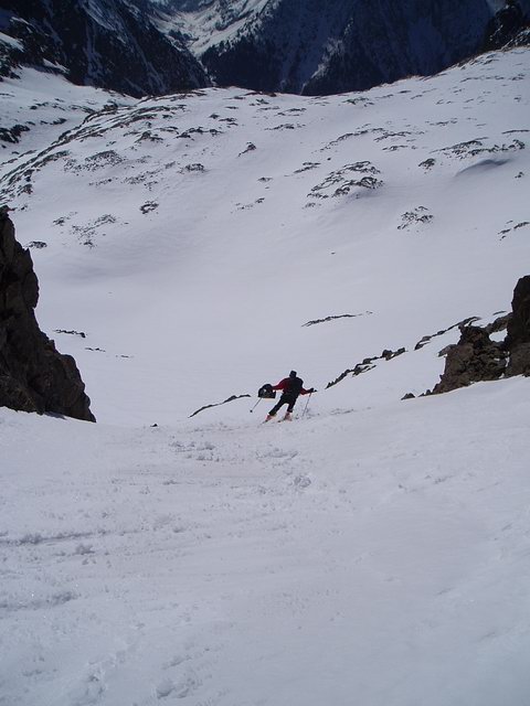 Montée par B14 : jusque vers 1700 c?est un peu fastidieux (forêt parfois dense, portage) en plus on est passé rive gauche, alléchant au départ mais plus compliqué ensuite. Descente par B16 : au départ on est descendu directement par un petit couloir juste à gauche du sommet, dans la barre vers 2500 on s?est trouvé une pente directe à gauche du passage normal, plus soutenu sur environ 150 mètres.