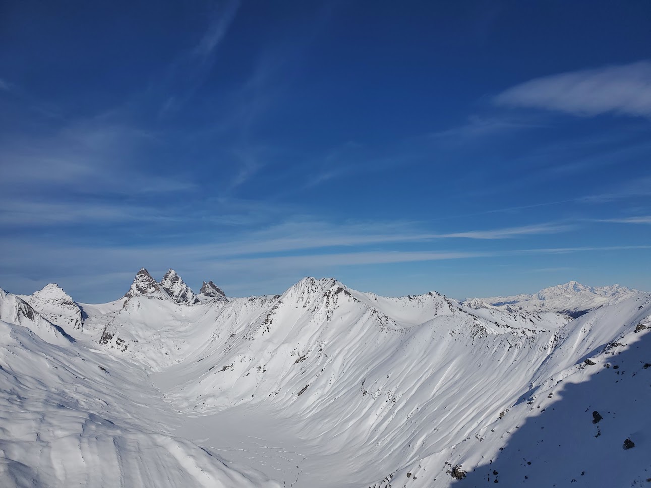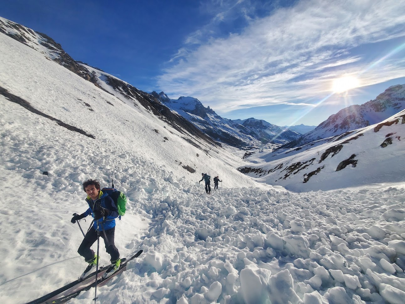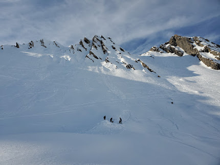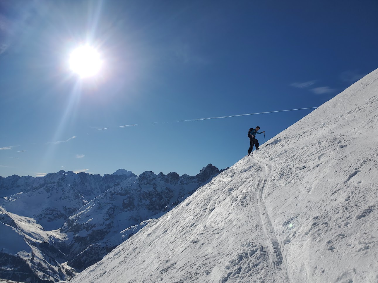 Sans le bon toponeige et la bonne carte (limite Ecrins N/Arves), on manque l'entrée du petit couloir à droite du Pic des 3 Évêchés en suivant gentiment la trace menant au point selle corniché. Le temps de s'en rendre compte, le couloir était déjà trop réchauffé et incrusté de pierres.
