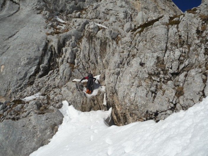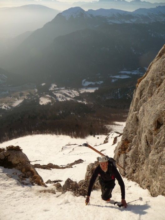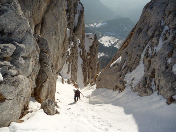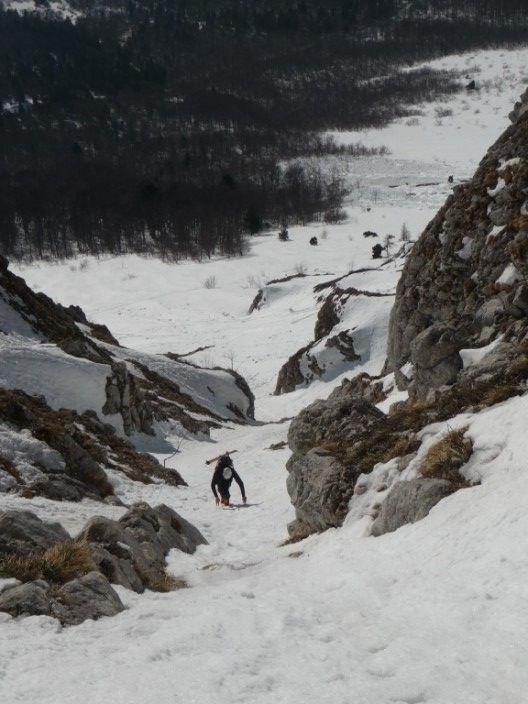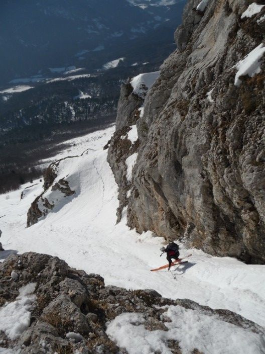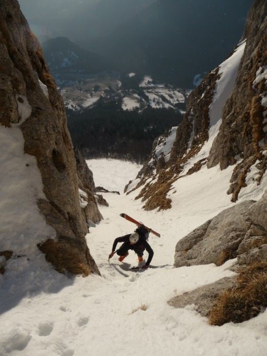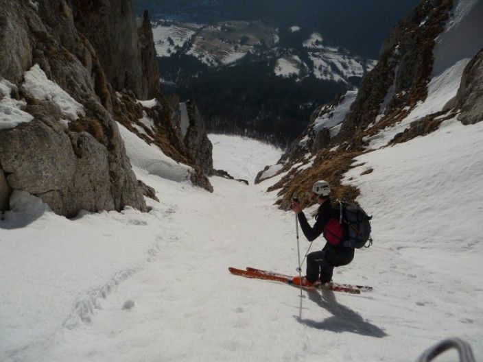 Répéré la semaine dernière, ayant très peu d'info sur ces couloirs, je voulais aller voir ce que ça donnait ; je n'ai pas été déçu : du raide, des étroitures, du sauvage ! Juste un déchaussage obligatoire dans le couloir Est (4.3/E3) et un passage de Dry dans le SE (4.3/E2). Les couloirs font tous les deux 200m. Le couloir Est étant exposé, ça n'a pas facilité le 1° virage de Régis en plein apprentissage de pente raide...