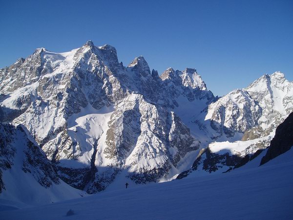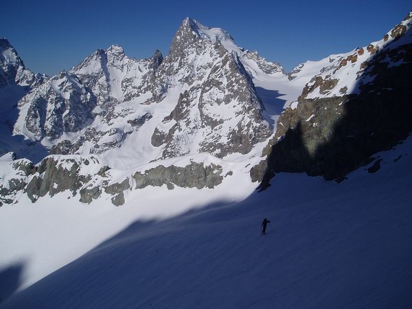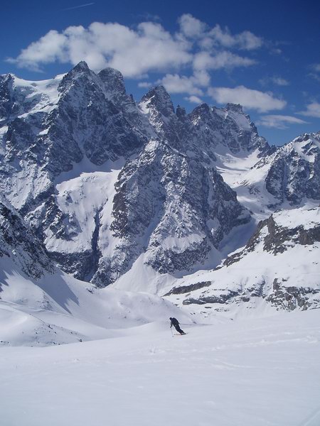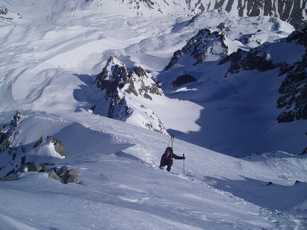 Superbe itinéraire qui permet d'atteindre rapidement les Agneaux en partant à ski de la voiture. Le paysage est magnifique, l'arrivée sur la calotte est vertigineuse. On peut d'ailleurs y faire quelques virages avant de rebasculer versant sud. Pour le haut la neige rencontrée, un peu croûtée puis dure mais limite cassante, a permis de maintenir éveillé le skieur assoupi par une suite de couloirs en poudreuse (un 4.2 plein d'ambiance). Après par contre 1500 m de ski qui tourne tout seul.