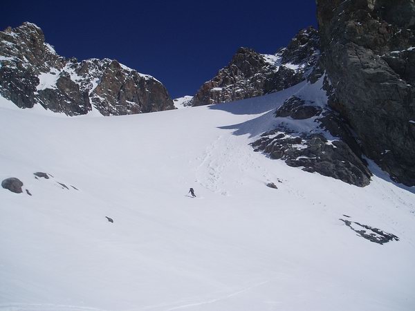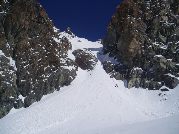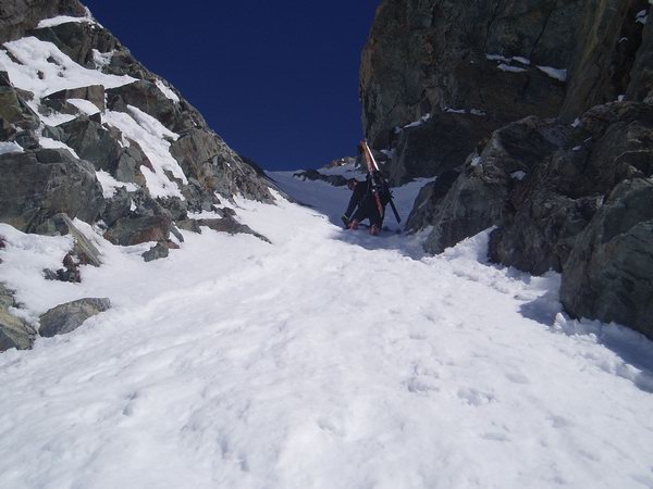 C6. La base du couloir final qui permet de déboucher sur l'arrête présente une étroiture goulottée que nous avons passée en crampons à la descente. Ca passait encore sans déchausser sous le refuge du Glacier Blanc.