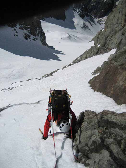 Montée évidente en contournant par la droite la pointe des Cinéastes. Problème pour surmonter la barre rocheuse vers 3160 m. Croyant voir une veine neigeuse rayant les rochers lisses, je l'ai remontée en crampons, mais il y avait plus de glace que de neige. Christophe a suivi ma trace, sans piolet... À la descente, en bas du glacier Tuckett, j'ai continué tout droit à niveau (2800) pour gagner les pentes sud-ouest qui descendent sur le petit lac sous le refuge (point 2438). De là, juste à droite, part un couloir qui s'incurve à gauche et permet de rejoindre presque sans déchausser le bas du glacier Blanc. De là, traversée, et encore un peu de ski jusqu'à la passerelle 2275.