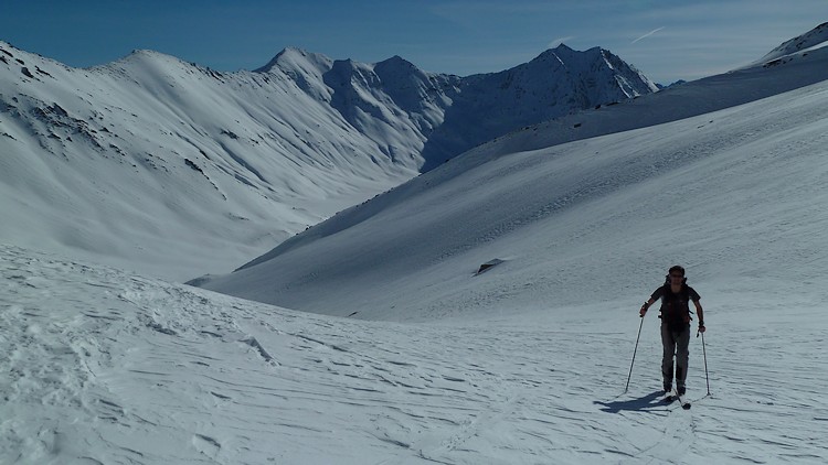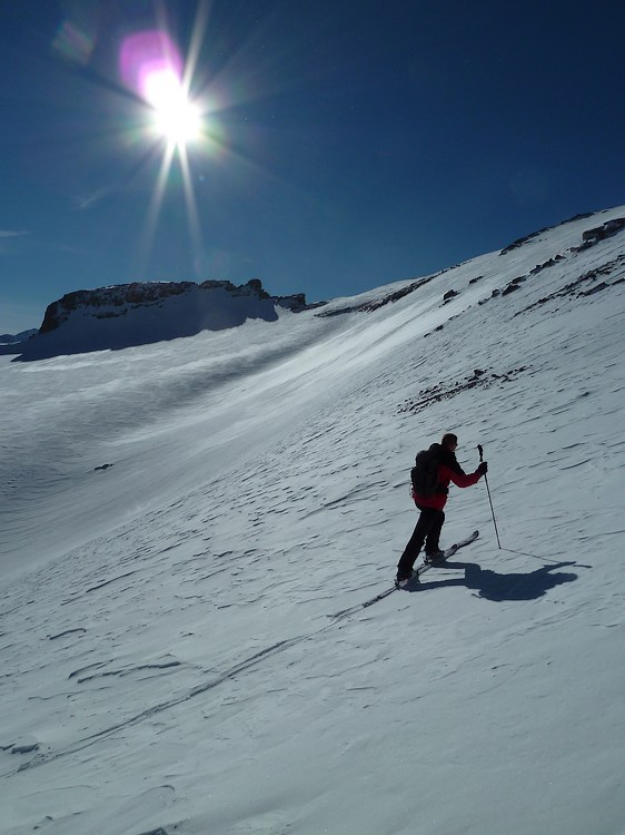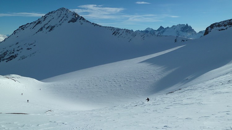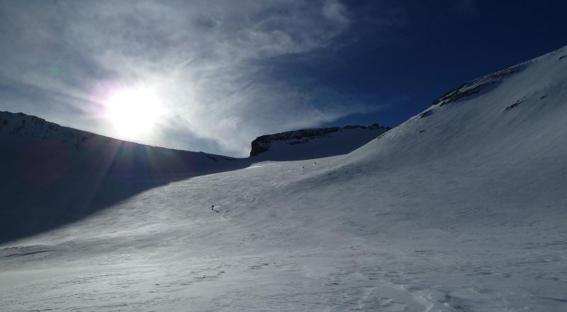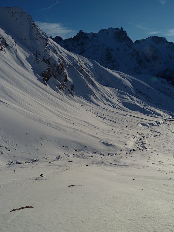 On laisse les deux groupes de [skitouriens->http://www.skitour.fr/sorties/pointe-salvador,31133.html#sortie] aller vers la Pte Salvador, et on se retrouve dans la solitude en direction du glacier Lombard, accueillis par quelques rafales d'un vent rafraichissant, sous le Goléon.