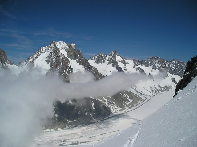 Les dernières chutes de neige de la semaine et de la veille ont laissé 15 à 20 cm environ très bon à skier. Etroiture bien enneigée, plus bas se méfier de la rimaye pas très visible. Glaciers tout de même bien bouchés.