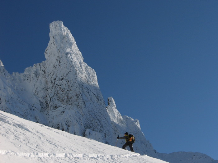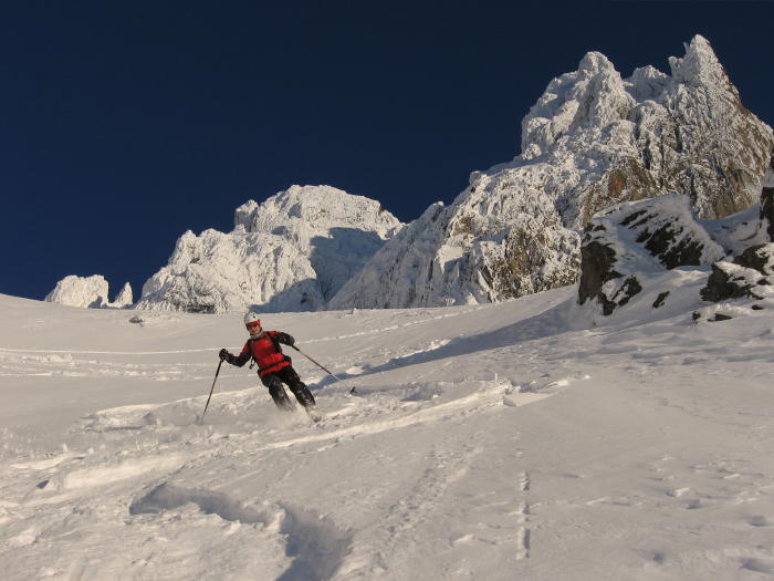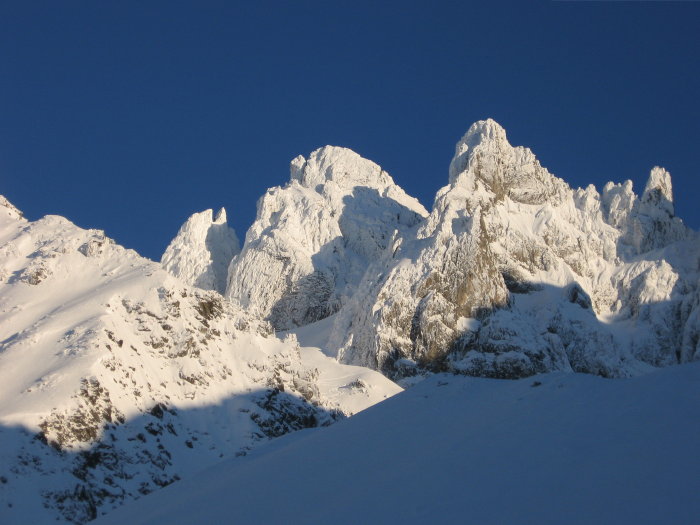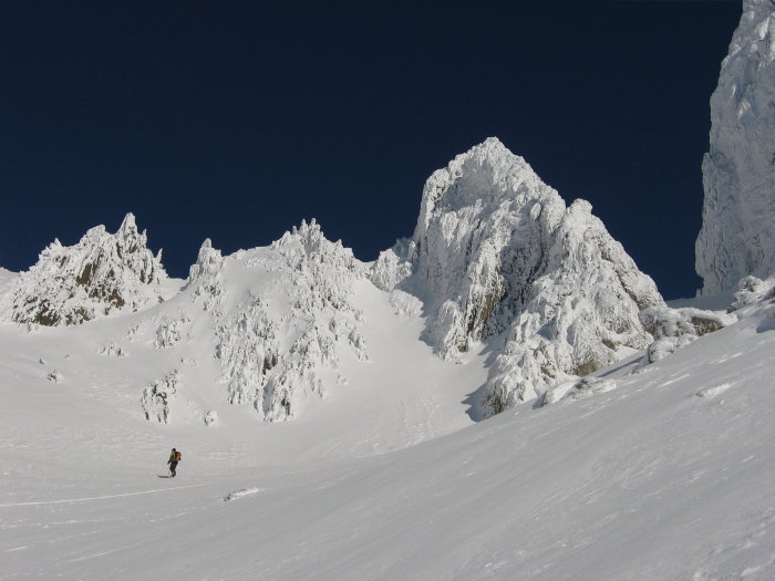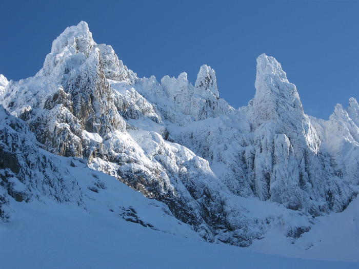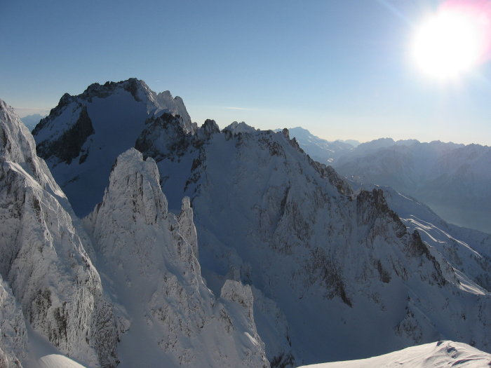 Depuis le temps que nous désirions contempler de plus près ces aiguilles plâtrées aux allures patagoniennes visibles lorsque l'on prend l'autoroute de Maurienne...C'est chose faite, avec un paysage somptueux. En raison du froid glacial et du brassage inhumain pour tenter de remonter un des couloirs N du pas de la balme, nous avons préféré remettre les peaux pour aller nous réchauffer au soleil et en prendre plein les mirettes avec les belles lumières de l'AM.