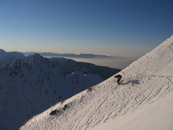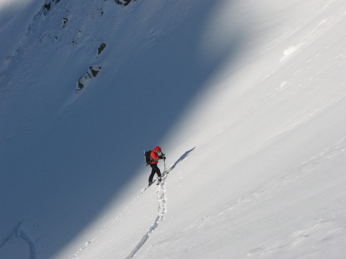 Monté au point coté 2683 des aiguilles de la balme par son versant Sud en suivant I11. Tentative avortée de remonter un couloir au N du pas de la balme car trop de brasse coulée à pied. D+/D-: 2000m, bien éprouvants avec le froid et la trace pénible dans les vernes.