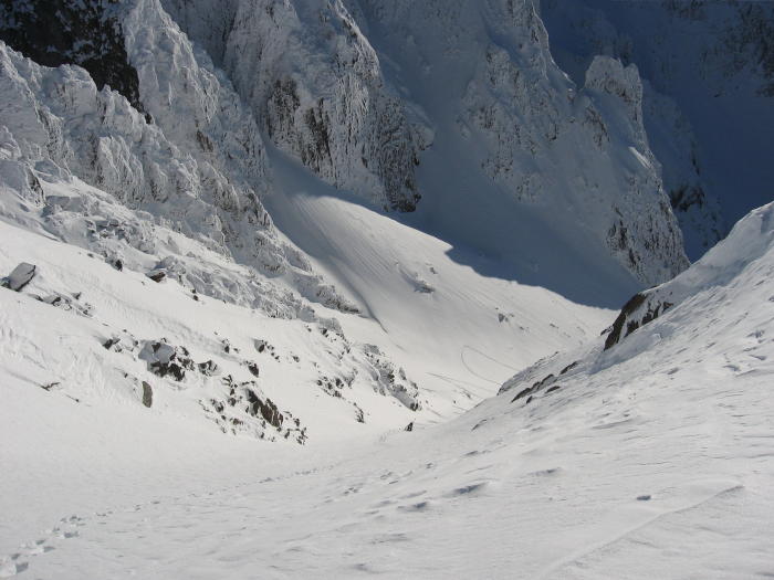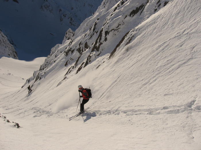 Le vent d'E a travaillé mais seulement en surface, formant des zones de croute froide portante alternant avec des zones de bonne poudre tassée. Ski excellent en visant bien les meilleures zones. Une avalanche déjà conséquente (rupture linéaire en versant W de roche Noire partie pendant les chutes) remplit le lit du ruisseau de la balme. Du coup nous avons perdu le sentier et nous sommes remontés trop rive droite dans les restes glacés de l'avalanche (crampons plus qu'utiles!) avec des ressauts verneux difficiles à négocier skis aux pieds. I10 pas en conditions.