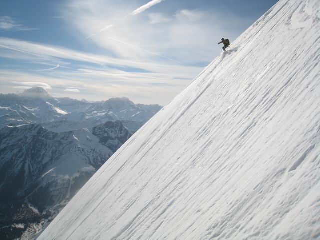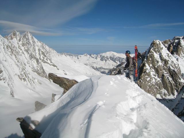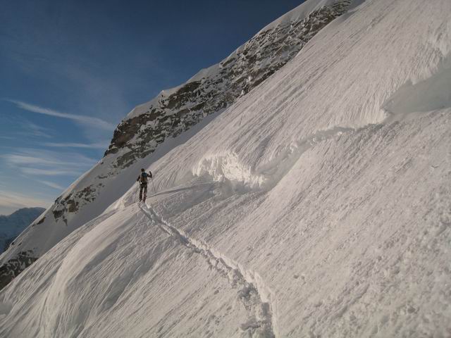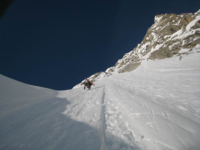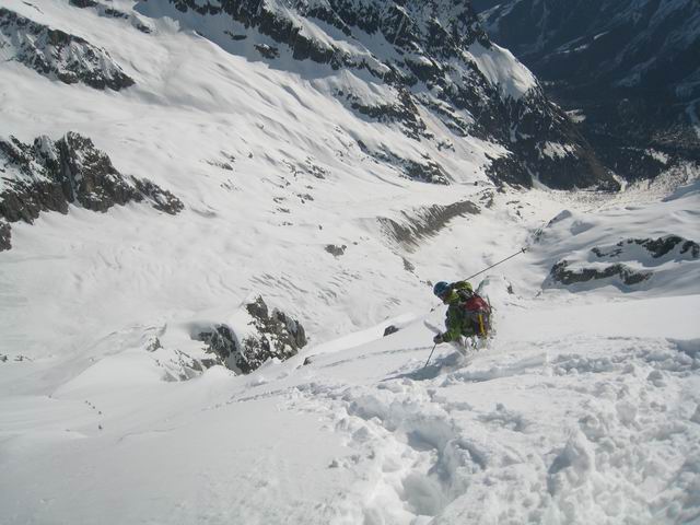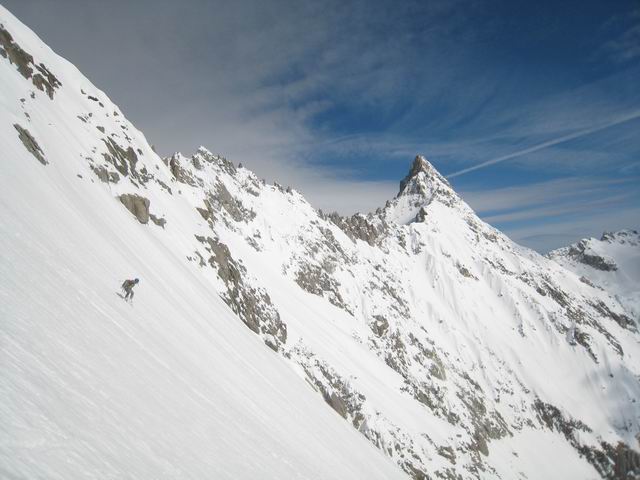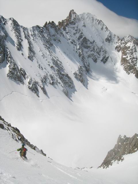 Siôt la rimaye franchie, la croûte observée plus bas à fait la place à une bonne poudre qui ne nous a plus quitté jusqu'au sommet de l'Amone. Seule une petite section un peu avant la pente terminale, était en poudre tassée du fait de quelques coulées, excellent donc. Alors que Manu et moi, descendus les 1ers, étions dans la partie inférieures nous avons vu débouler pendant 5' au rythme de toutes les 30" une série de purge venues de la pointe de la Fouly. Du coup, nous n'avons pas vraiment pu savourer cette partie, nous qui avions pris soin de partir tôt. Ensuite tout s'est calmé, et nos suivants sont passés tranquilles (hormis un Italien scotché au dessus de la rimaye qui a pris 3 sur la tête et qui attendait on ne sait quoi