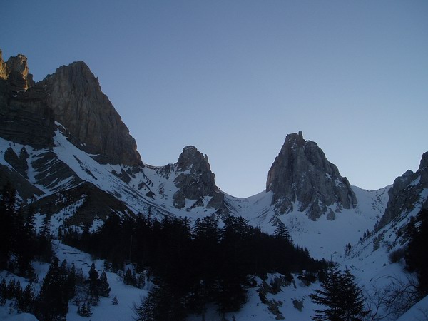 Depuis que j'ai découvert ce coin (il y a [3 semaines seulement -> http://lesbertonches.over-blog.com/article-16019871.html]...) et après la visite de mercredi, j'avais vraiment envie de venir au milieu de ces belles aiguilles. Il y a de l'ambiance et un peu de gaz dans la face, casque fortement recommandé même dans le col des Aiguilles qui parpinait déjà tôt ce matin. Discussion sympa au retour avec un gendarme et une gendarmette de Lus qui venaient de faire un aller retour au col de Corps (H15) plus trop poudreux. Apparemment ils pratiquent la rando à la gendarmerie de Lus et ils m'ont dit de pas hésiter à les appeler pour avoir des renseignements sur les conditions du secteur.