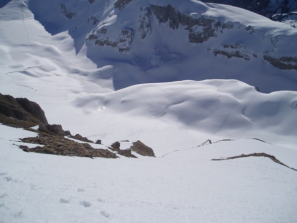 Pas de surprise en sud, transformée avec comme pour Nicolas lundi un petit fond dure en dessous. Le passage le plus dur fut le versant w du col des Aiguilles où à la montée sans faire attention je me suis retrouvé presque au taquet dans du 30 degrés vitrifiés. Pas de couteau, j'ai mis les crampons. A la descente en passant rive gauche on évite ces zones pas très agréables.