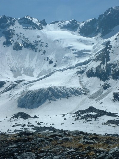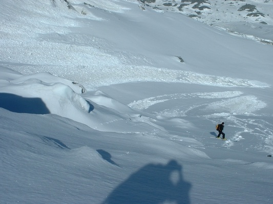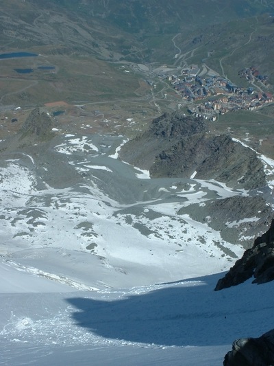 Moyennant un 4x4 , on est montée relativement haut et pres du chaussage, 20mn de portage à la montée , sinon compter une petite heure si stop vers 2450. Ensuite c'est du soutenu sans être raide, mais evident de bas en haut et retour. Avec un minimum de repérage à la montée ,plusieurs possibilités au travers des différentes zones de crevasses (bouchées) et seracs. Descente directe pour nous. Cot 3.1 / E2
