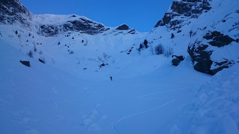 Le BRA annoncait de la neige continue jusqu'à 1000m en face N, on a vérifié que cela ne s'applique pas aux sous bois. Ce n'est pas grave, cela valait le coup de porter pour visiter un endroit aussi sauvage. Belle descente panoramique mais le fond dur était une peu trop présent pour pouvoir se lâcher.
