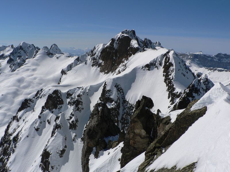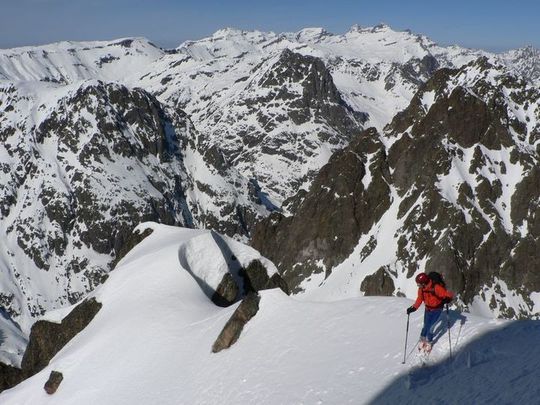 Je voulais repérer l'accès au couloir NO des Chamois (A19.1) par l'arête OSO que l'on emprunte l'été à la descente quand on fait la traversée Persévérence-Chamois. A une brèche 20 m sous le sommet, nous nous sommes laissés tenter par un premier couloir très étroit (à peine 1,80 m par endroits) sur une soixantaine de mètres avant de tirer à gauche pour rejoindre les pentes qui descendent du col de Beugeant. Au final, l'accès par l'arête OSO est esthétique mais délicat surtout avec les skis sur le sac (passages mixtes et rocheux en III). Quant au premier couloir que nous avons descendu, il est plus court que A19.1, plus étroit et son remplissage sans doute plus aléatoire ; bref d'un intérêt plutôt anecdotique.
