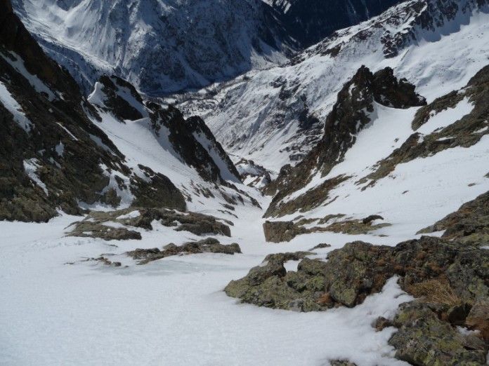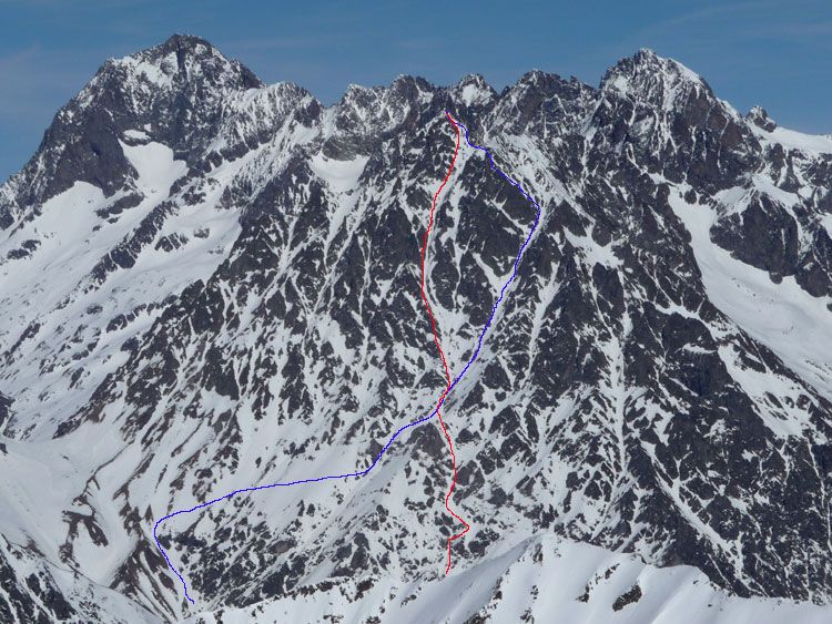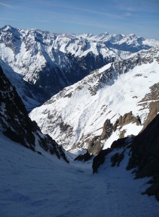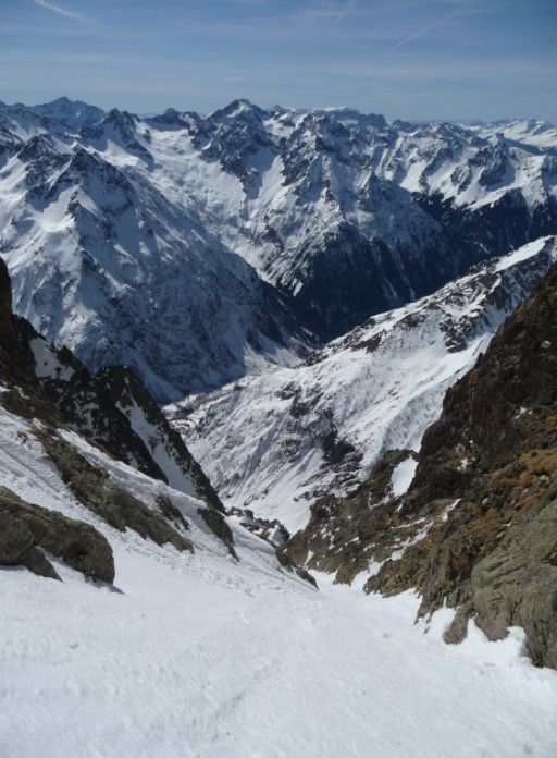 Idem topo jusqu'au pied du couloir (2200m) puis ayant le temps, je voulais voir le couloir rive gauche, que j'ai remonté qui finit sur la pointe 2959m (celui-ci est plus large que le couloir SW, souvent en meilleur condition car moins goulotté) > traversée alpine et facile vers le sommet 3046m > descente du couloir SW > au pied du couloir, descente directe du bas de la face jusqu'au ruisseau de la Laisse (1574m) !