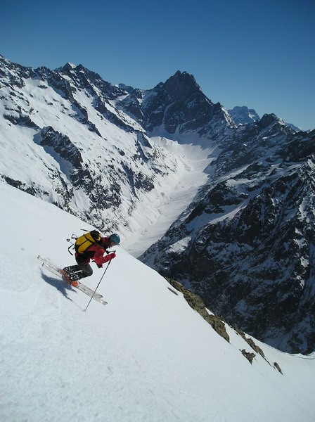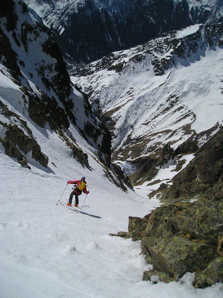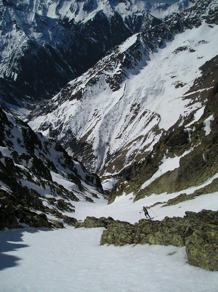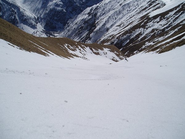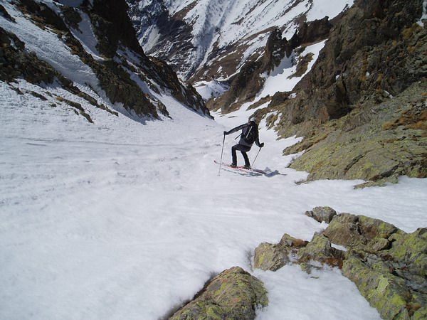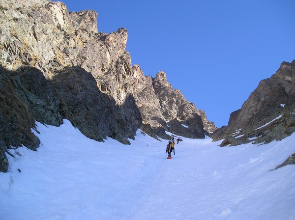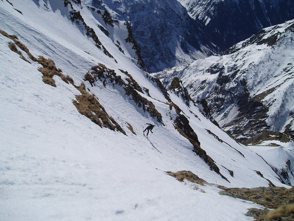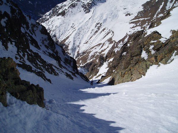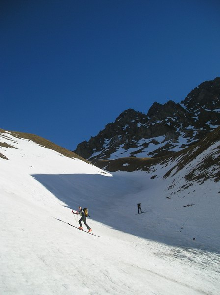 A/R selon le tracé en bleu sur photo 1 de la course de [Manu -> http://www.volopress.net/volo/sortie3289.html]. Arrêt sous le sommet 2959 à l'endroit où ce n'est plus skiable (neige vraiment très molle dans cette zone du fait de l'orientation sud). Le couloir de droite plus étroit nous paraissant un peu plus ravagé et celui-ci étant vraiment joli et en bonnes conditions on n'y a pas résisté. Pareil pour la descente direct, des zones avaient bien purgé depuis samedi alors que le border cross du Col des Marmes nous tendait les bras.