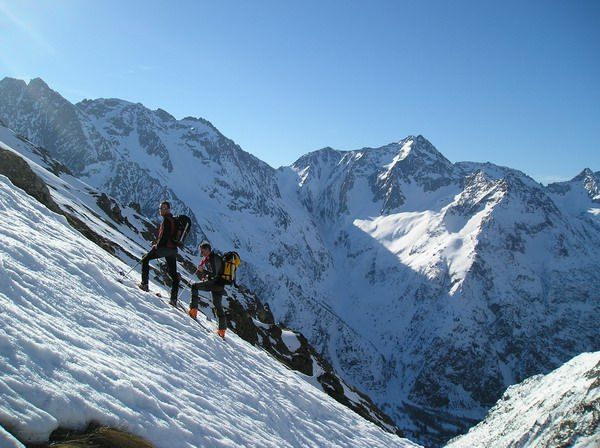 Ambiance superbe et super ski au milieu de ces belles tours et dans le border cross du col des Marmes. Si du bas l'itinéraire ne paraît pas évident, en fait en traversant bien à droite à la cote 2200 c'est le seul gros couloir qui descend du haut. Ensuite une fois dedans, l'attaque des 2 couloirs se dévoile rapidement. Merci à Manu, qu'on n'avait pas pu accompagner samedi, pour le repérage.