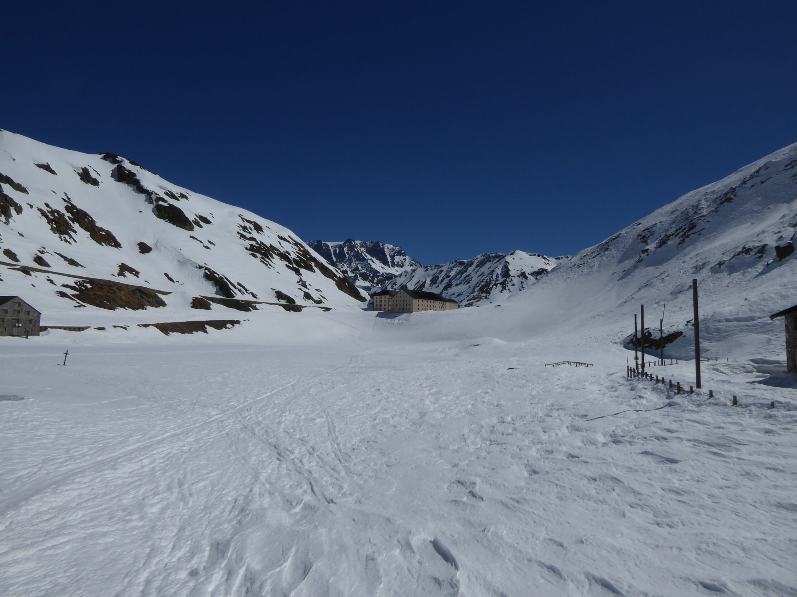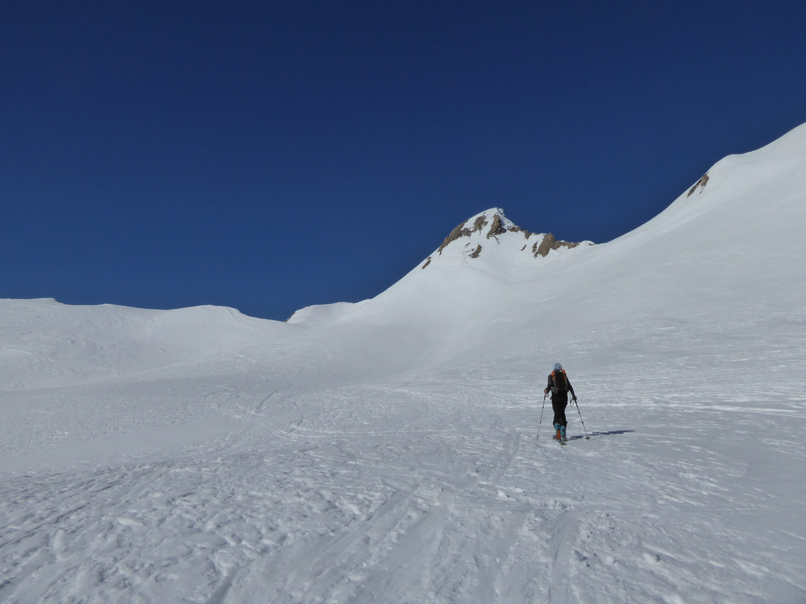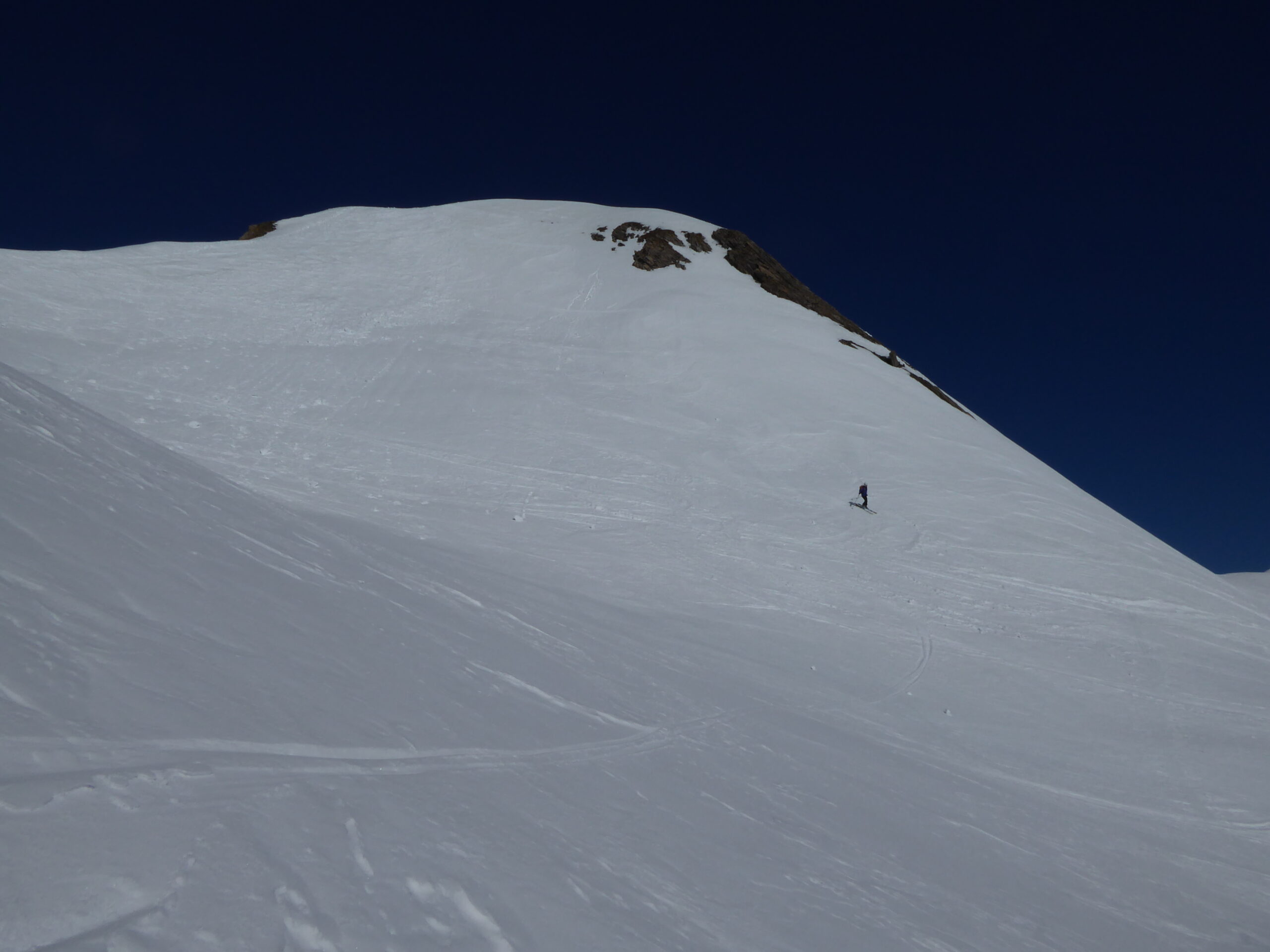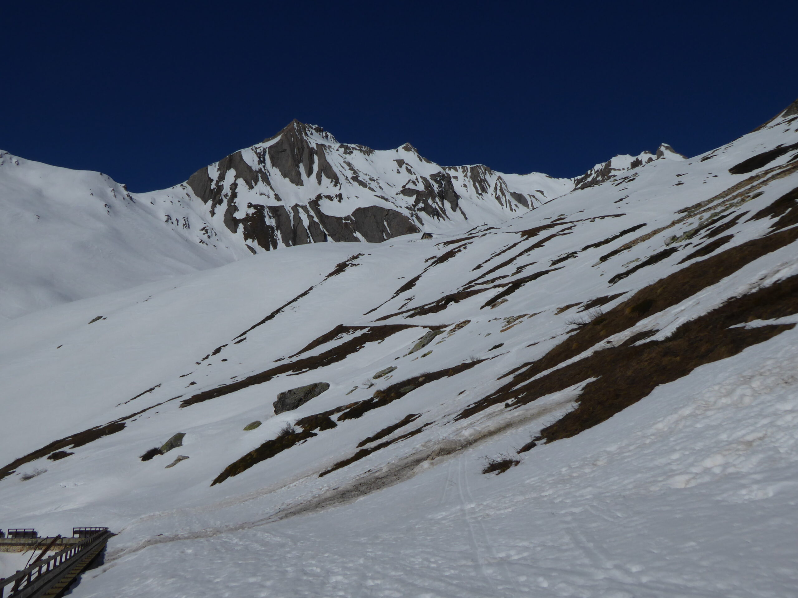 De l'hospice du GSB, descente par la route jusque 2100. Montée dans la combe SE au-dessus de Tsa d'Arc puis à gauche pour rejoindre le plateau sous le sommet. derniers mètres à pied par l'arête sud neigeuse. Retour à l'hospice par le même itinéraire.