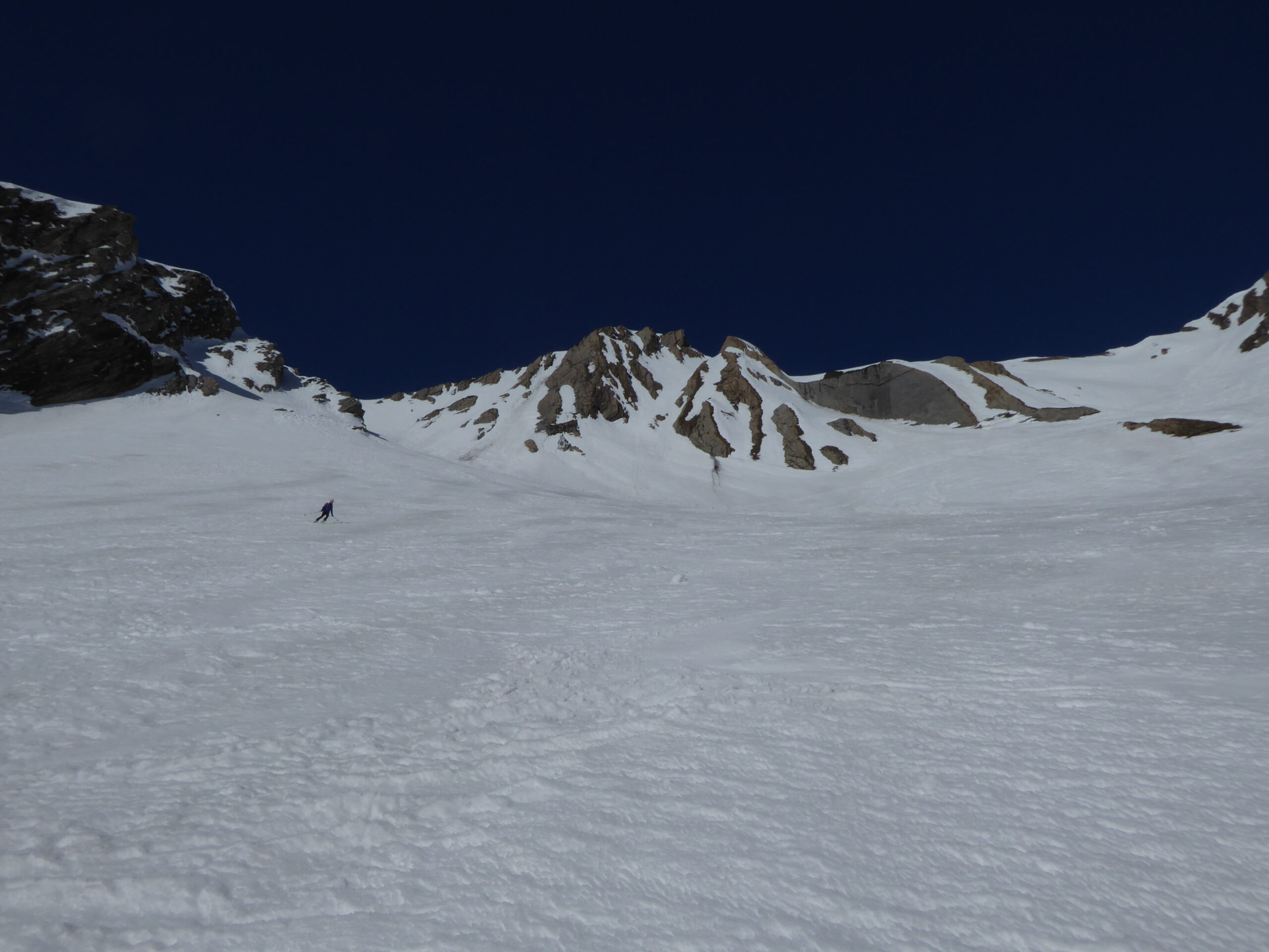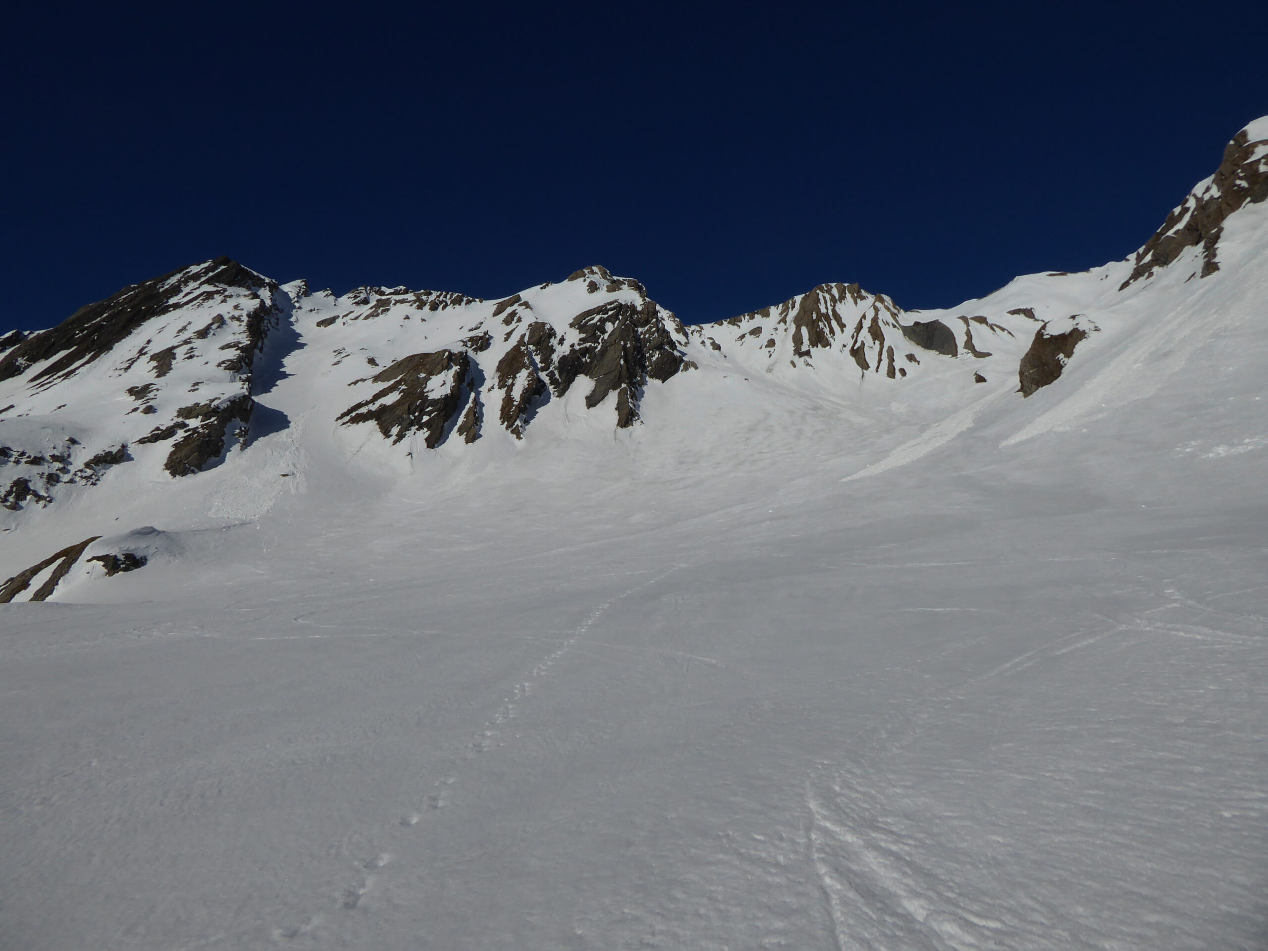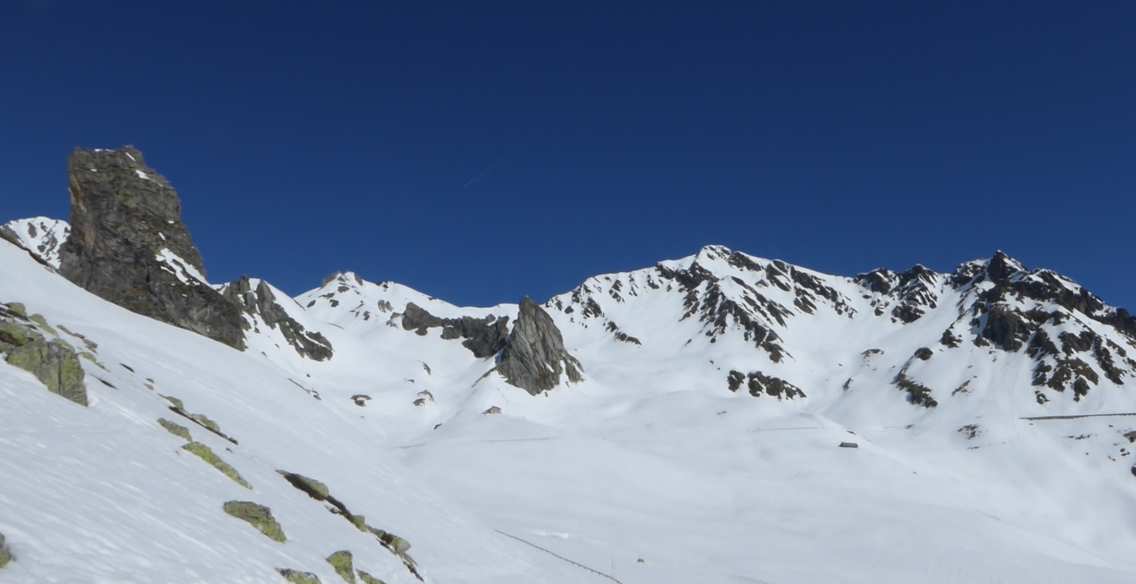De l'hospice du GSB, descente par la route jusque 2100. Montée dans la combe SE au-dessus de Tsa d'Arc puis à gauche pour rejoindre le plateau sous le sommet. derniers mètres à pied par l'arête sud neigeuse. Retour à l'hospice par le même itinéraire.