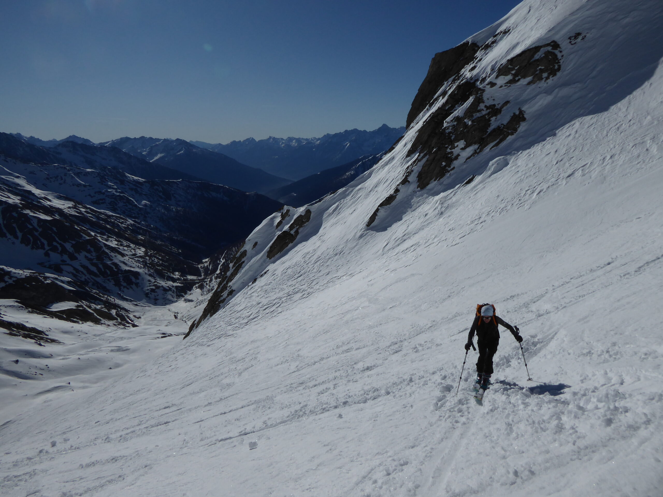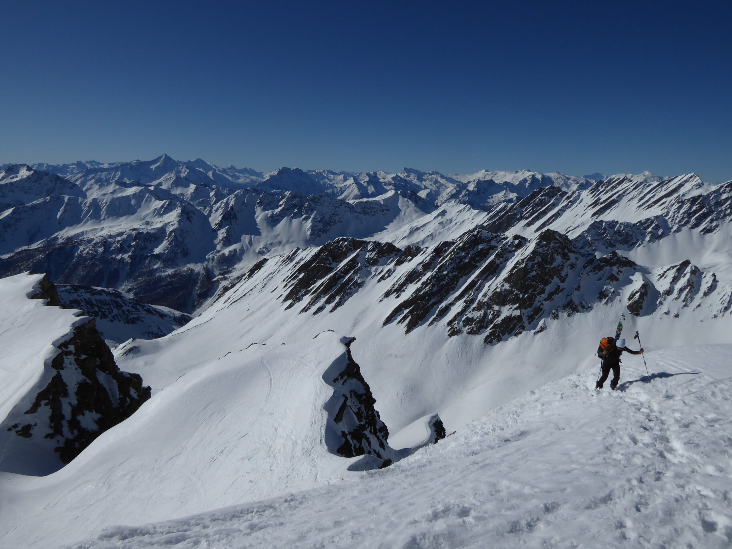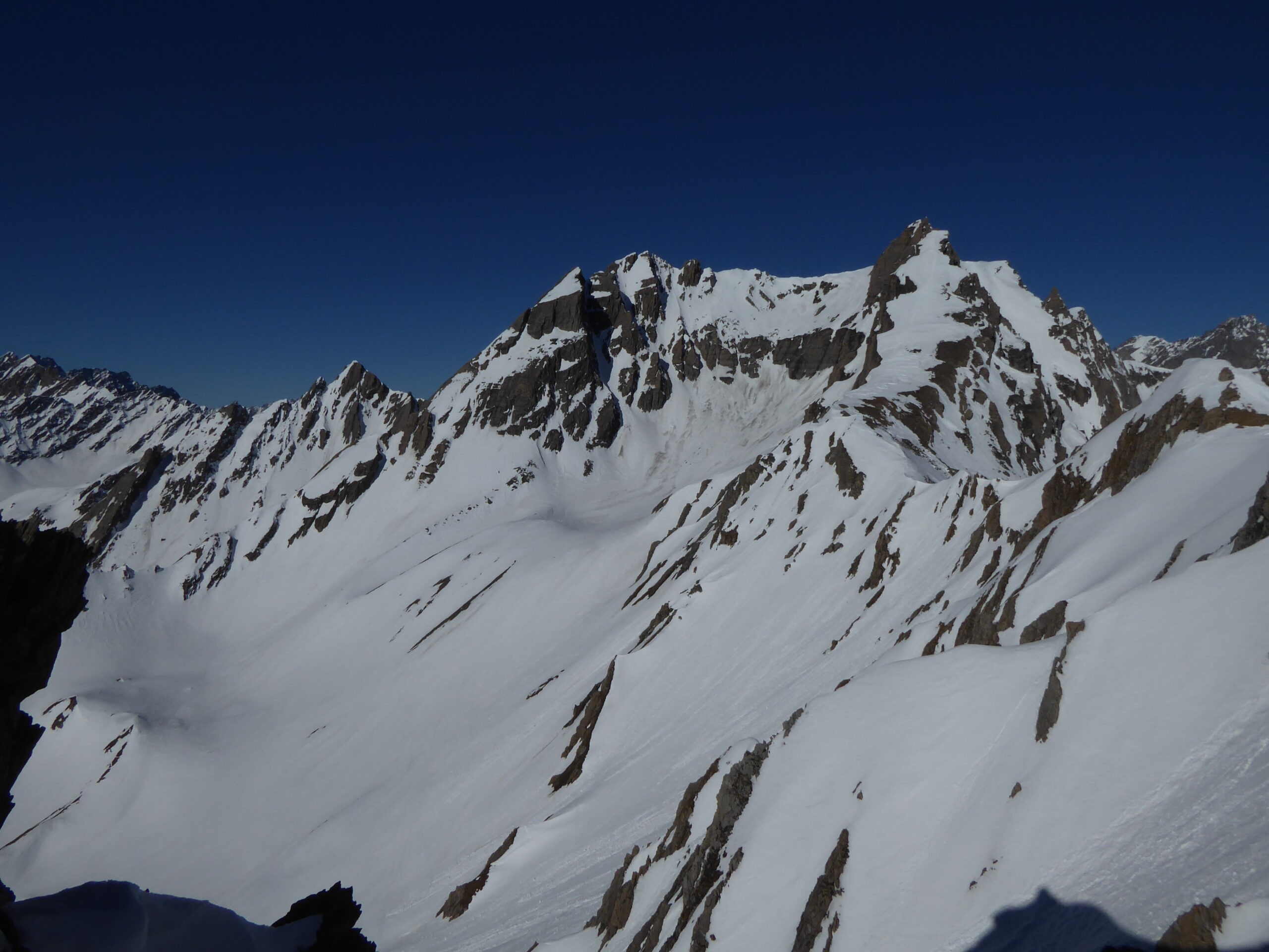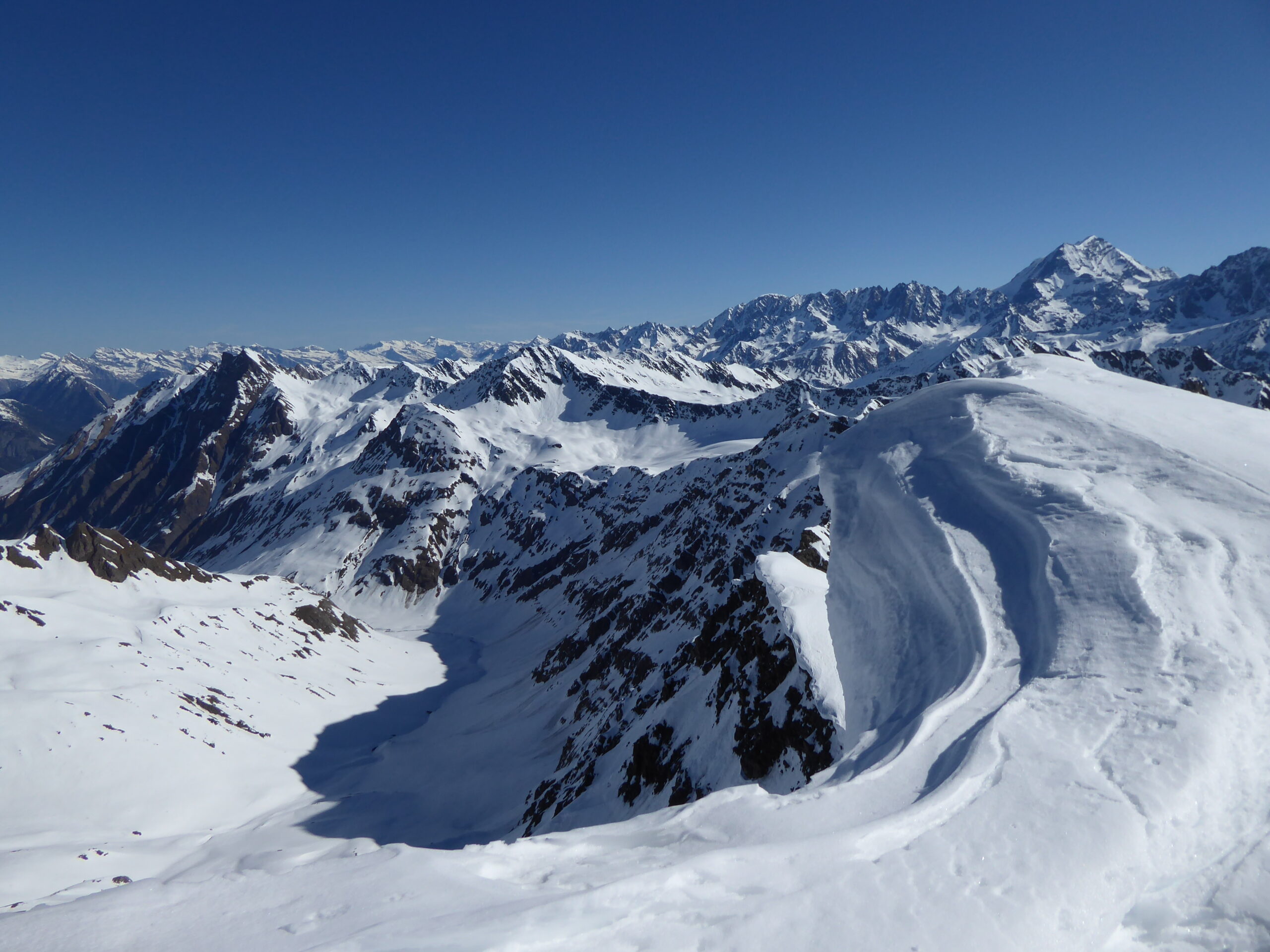 De l'hospice du GSB, descente par la route jusque 2100. Montée dans la combe SE au-dessus de Tsa d'Arc puis à gauche pour rejoindre le plateau sous le sommet. derniers mètres à pied par l'arête sud neigeuse. Retour à l'hospice par le même itinéraire.