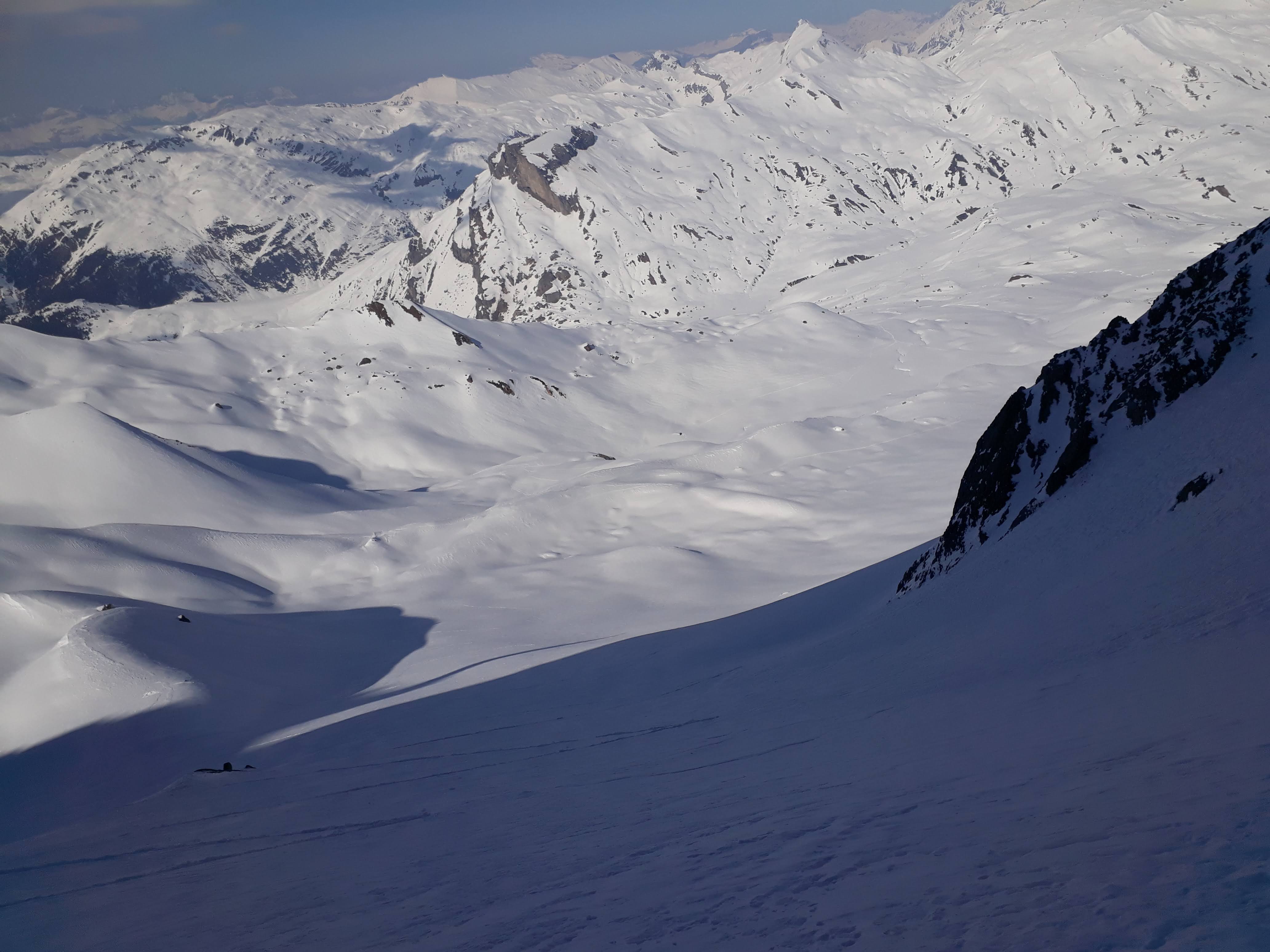 On décide de profiter de la descente plutôt que suivre l'arête, qu'il faut rejoindre par une petite traversée sur versant quasi ouest à 45°.