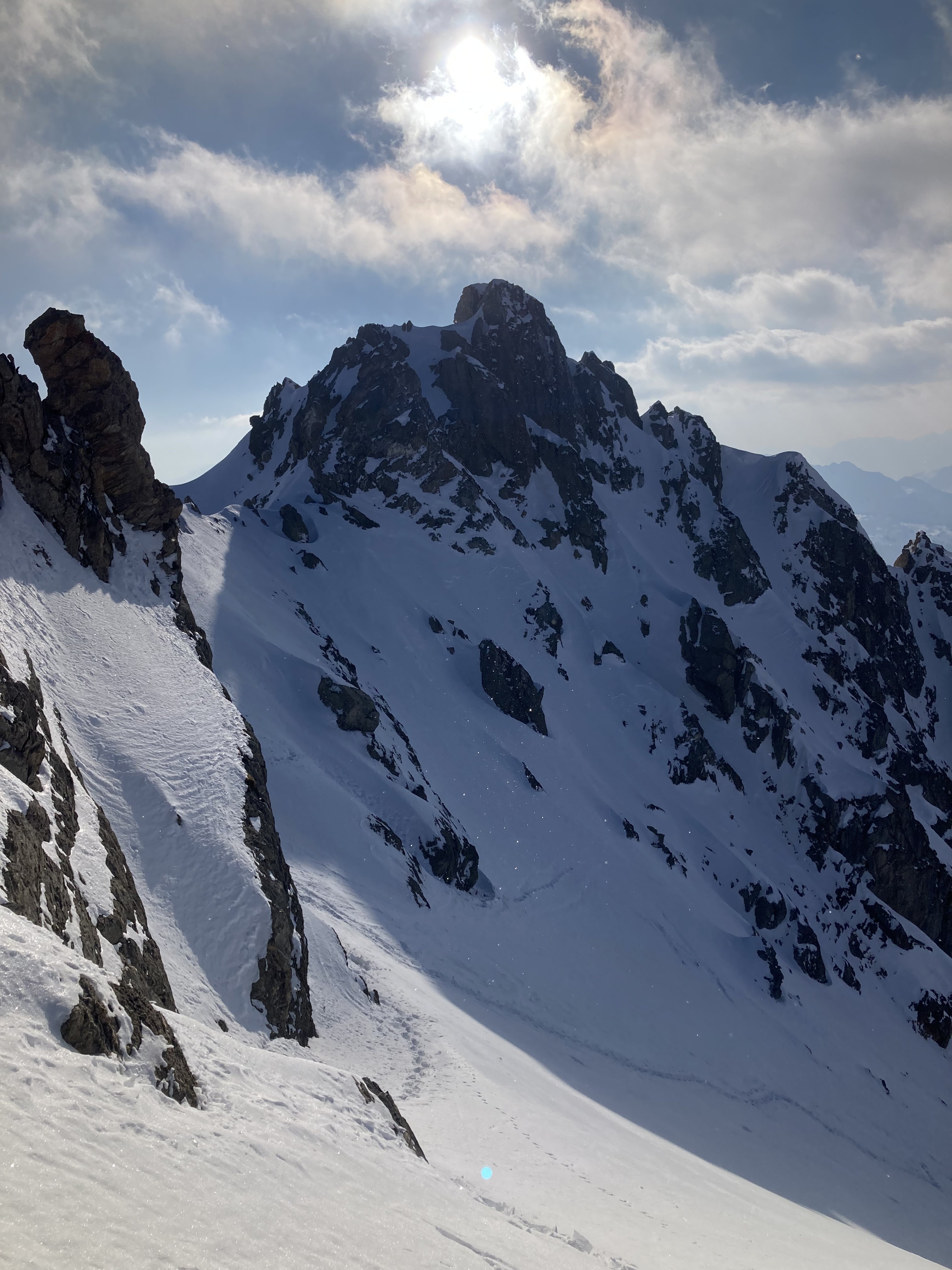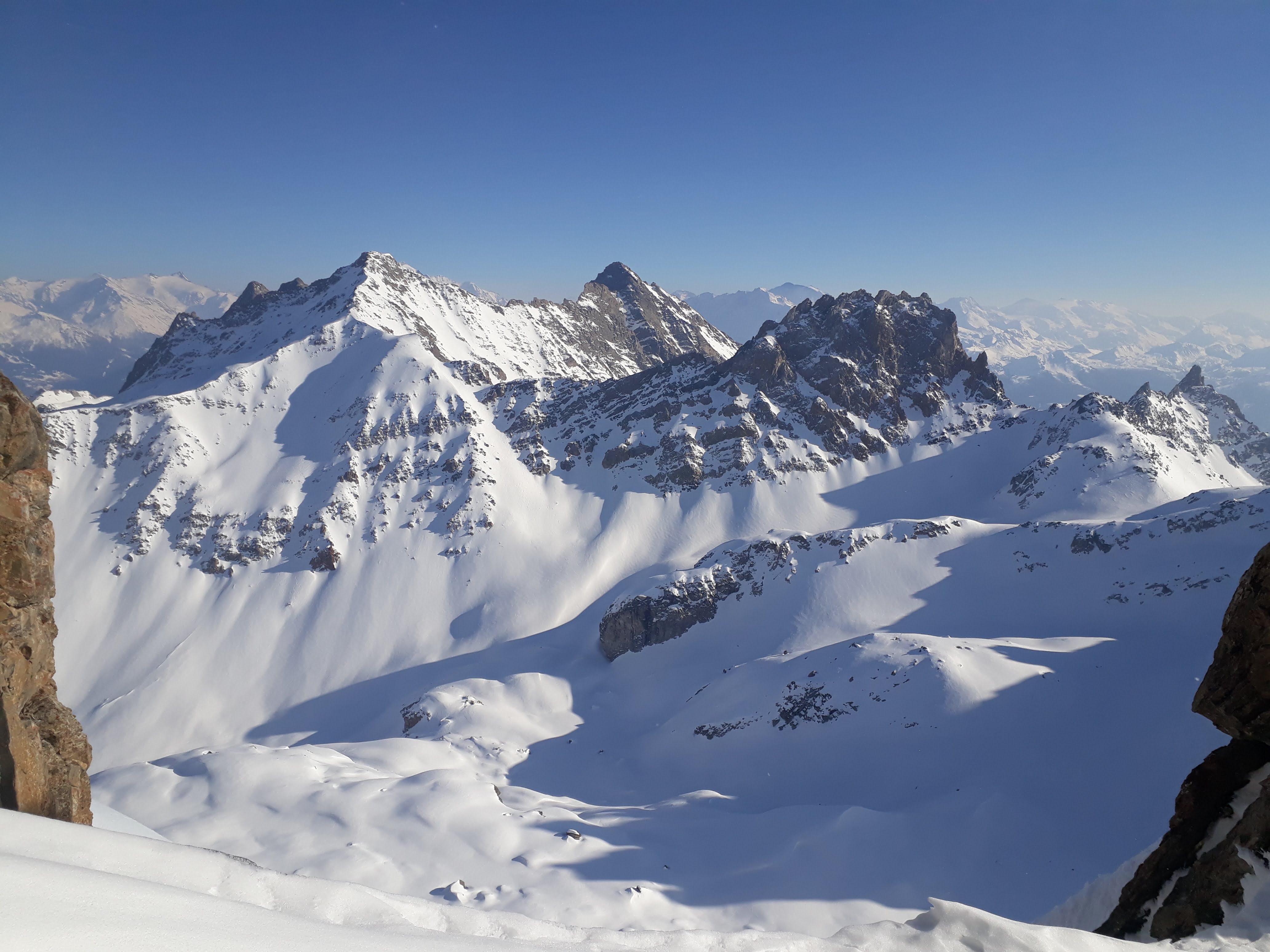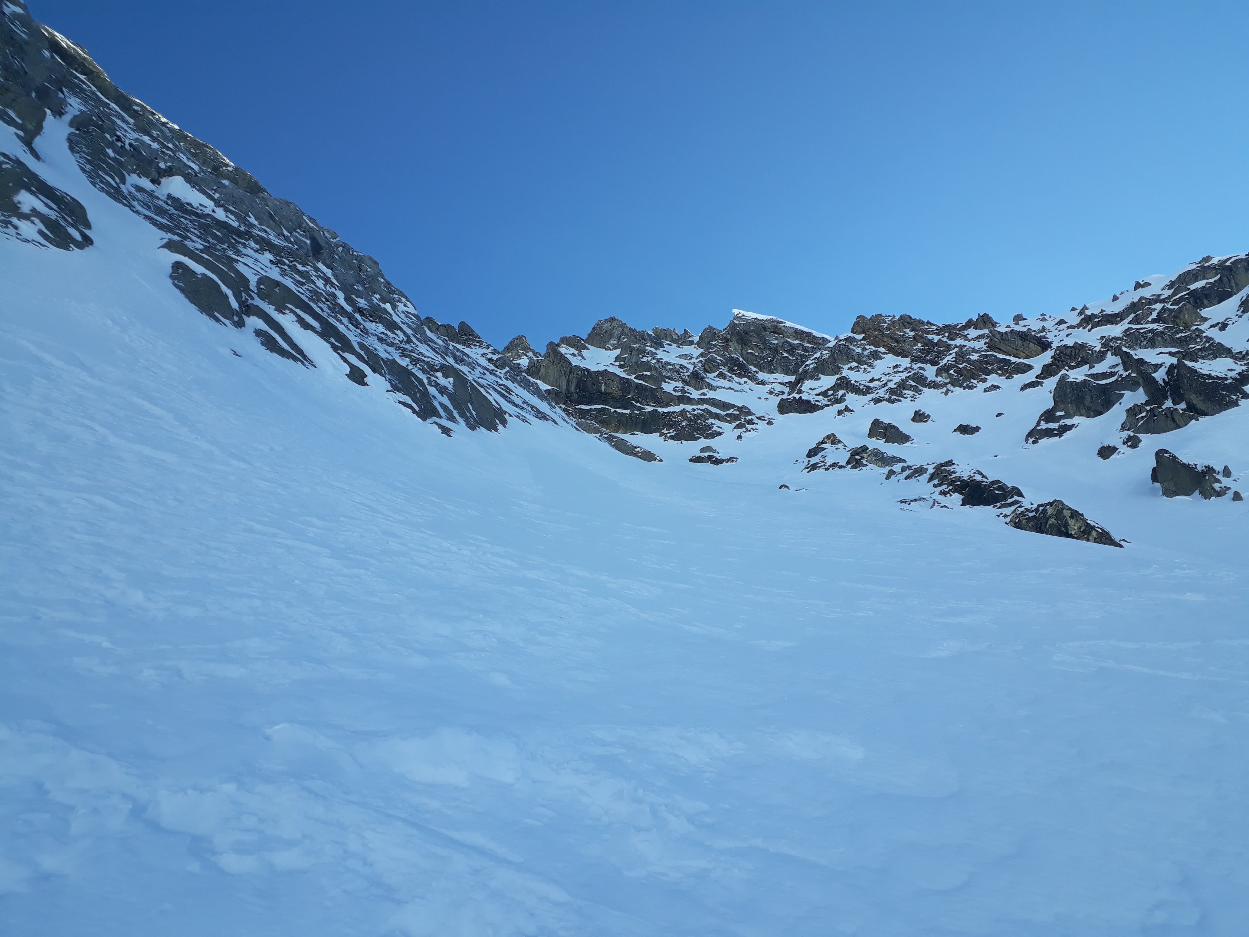 plan de la Lai (12h) -> ruine d'Arpire invisible sous la neige (12h40) -> on quitte des traces de montée pour rejoindre le vallon balcon un peu plus au sud -> Pique-nique sous le couloir au replat ensoleillé à 2500m (13h30) -> montée à pied à partir de 2700m (15h), pas de trace, on s'enfonce parfois à mi cuisse -> 16h30 au col à 2850m.