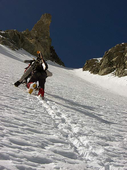 Du très beau ski après une montée un peu fatiguante à brasser la neige en altitude. Y'a pas à dire, ces grandes pentes du Mont-Blanc, quand c'est bon, c'est toujours aussi beau et impressionnant. Quant à l'aiguille, on espère qu'elle ne va pas trop remuer quand on voit de près sa structure filiforme et surplombante.