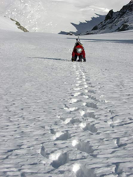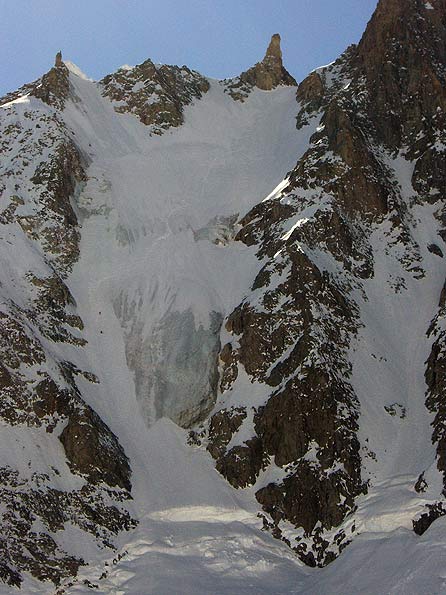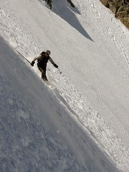 Grands Montets => glacier d'Argentière => pente à gauche de la NE des Courtes. Un peu moins longue que cette dernière (près de 600 m quand même) mais plus sérieuse avec un mur très raide d'environ 200 m le long de la langue de glace. La deuxième partie est un grand amphithéâtre aussi large que haut plus "tranquille".