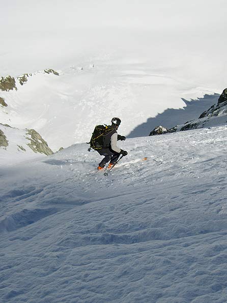 Dans le couloir, on distingue trois parties : 250m du bas en neige tassée (couloir le long de la langue de glace régulièrement lissé par de petites coulées) ; 50m médians où la glace n'est pas loin (bombé) ; 300m supérieurs en grosse poudre.