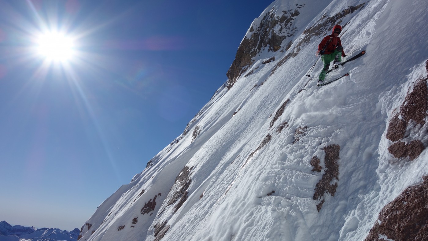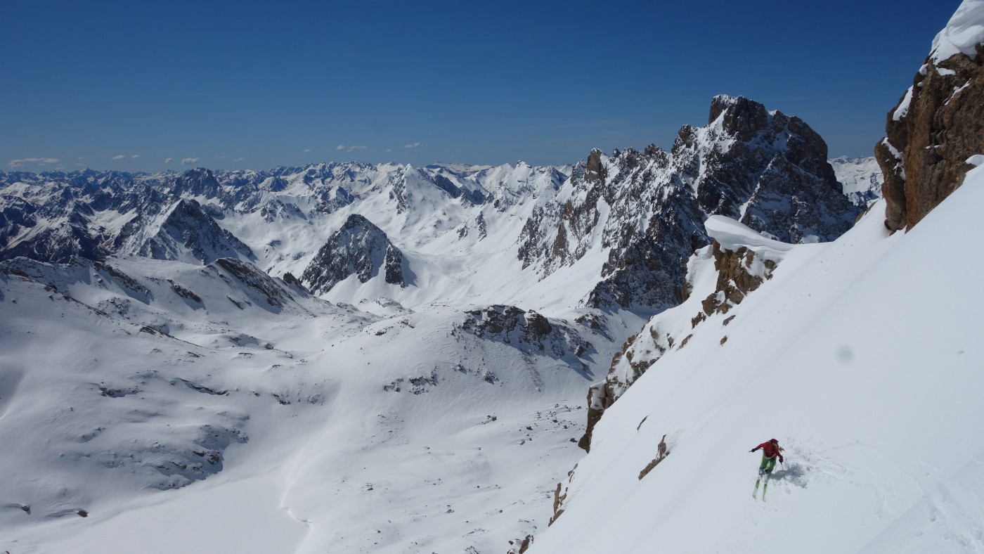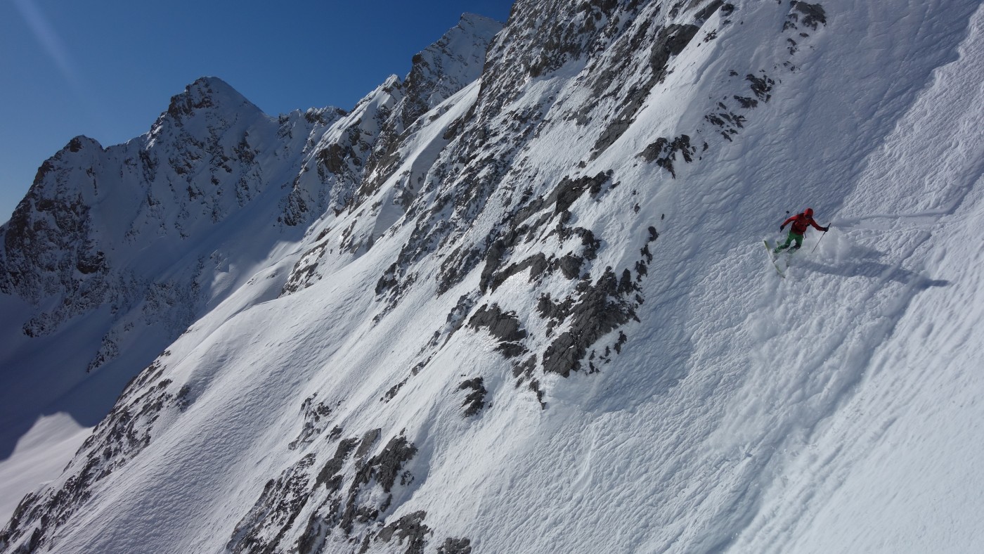 Cet enchaînement semblait utopique : réunir en mai la neige collante en nord avec un enneigement suffisant en sud (plutôt mars) et une journée froide pour skier en sécurité ? Un casse-tête que les dieux Ubayens ne servent sur un plateau que tous les 10 ans. Début par la directe nord des Aiguilles, la plus dure. La ligne absorbe les rayons du soleil mais le vent de nord limite le réchauffement : poudre tassée, neige de cinéma, la face est skiée sans rappel. La remontée du Jean Coste est débonnaire mais énergivore. La sortie au sommet aimante nos yeux vers le couloir nord du Brec. Il reste encore 1600 m de D+. Le couloir nord du Brec, en neige plus ferme se descend sans encombre. Les deux montées et descentes suivantes sont moins exigeantes. La directe nord de Chauvet est raide et exposée mais courte alors que le couloir Jean Coste est large, moins raide. La neige se réchauffe lentement. Les deux ultimes descentes sont en neige parfaite avant les gazons qui nous séparent du départ de Maljasset.