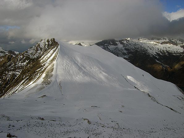 Quelques corniches déjà en place sur la crête de Côte-Belle (vent du sud persistant depuis un mois). Neige humidifiée en nord sous 2600, transfo dans les hautes orientations à même altitude. Plus haut, pas beaucoup plus de neige mais déjà des accumulations importantes dues au vent.