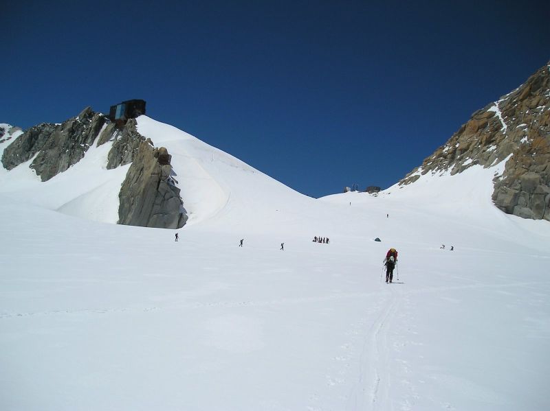 Arrivés tôt la veille à l'Aiguille du Midi pour rejoindre le bivouac de la Fourche, la visibilité nulle là-haut nous mène tout droit au refuge des Cosmques où on passe la journée à guetter une éclaircie qui ne viendra que vers 19h au grand soulagement des cordées qui se sont faites surprendre dans l'ascension du Mont-Blanc et obligées de patienter soit à Vallot soit dans un trou de neige.