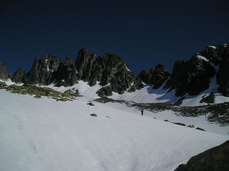 Montée à la brèche à gauche de Tête de la Cos versant S; descente versant N jusque dans une cuvette 300 m plus bas environ. Remontée plein Ouest en direction d'une brèche orientée Est non nommée sur la carte. On passe au pied du coup de Sabre du Piniollet. De cette brèche descente du versant opposé (assez étroit ; 2 pas de désescalade facile). Montée en AR à la brèche du Chien. Retour par la combe de la Croix.