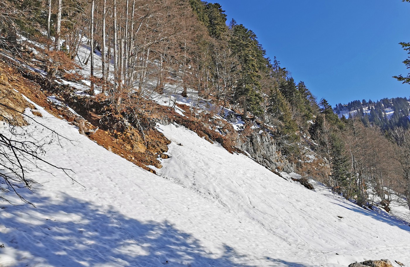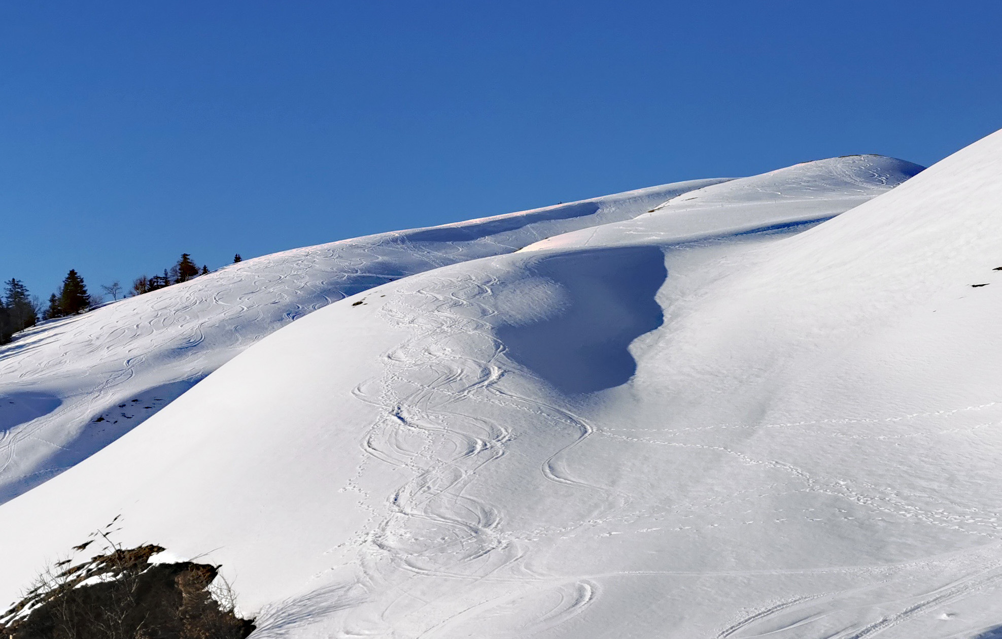 - Entre 1650 et 1350 c'est une très belle combe bien marquée (pass. 35-40°) avec des contre-pentes froides en rive gauche, chaudes (transfo) en rive droite. Comme ailleurs la poudre devient croûtée sous 1400, même à l'ombre.