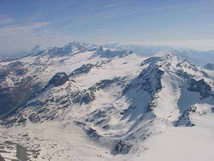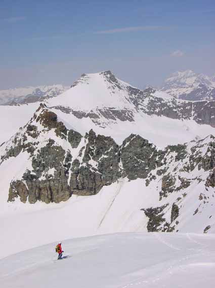 Jolie bouclette dans le cirque des Evettes, la reconnaissance à vue est suffisante pour ce genre de face en neige de printemps. Les plus carnivores du groupe, Lionel, David et Serge, spécialistes des Ecrins, séduits par ce massif qu'ils ne conaissaient pas, finissent la matinée en empilant avec la petite Ciamarella (course 02-177)