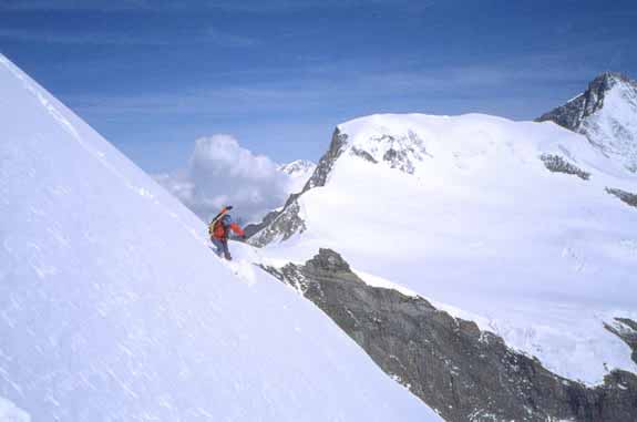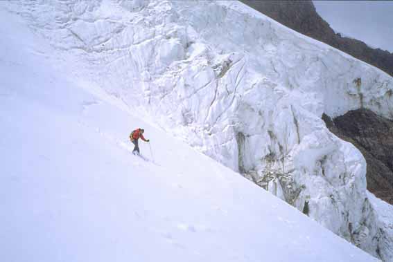 On paye le prix (tout est payant et c'est pire qu'à Cham.) mais on fait un beau tour d'acclimatation. 2 4000 à la clef et un itinéraire tout en boucle. Qq piétons et seulement 5 skieurs sur ces sommets. Pas de portage mais heureusement que la gare de la Langflue est à 2850 m. En-dessous de 2800 m, il n'est plus possible de skier.