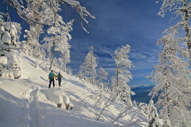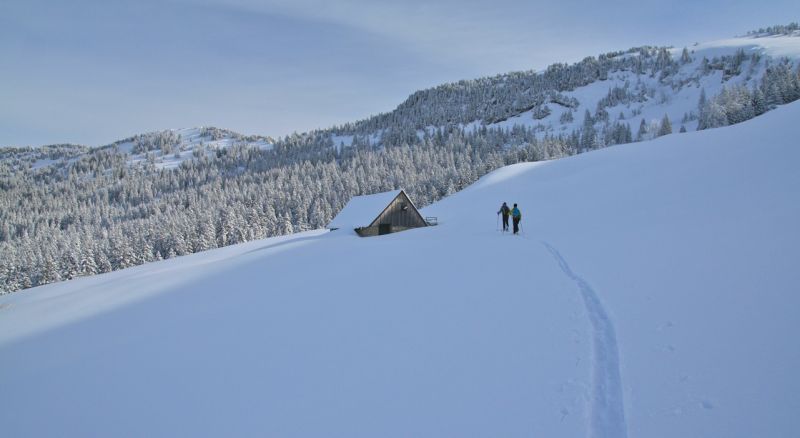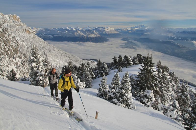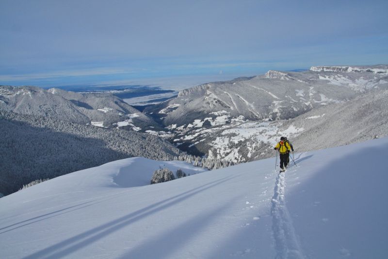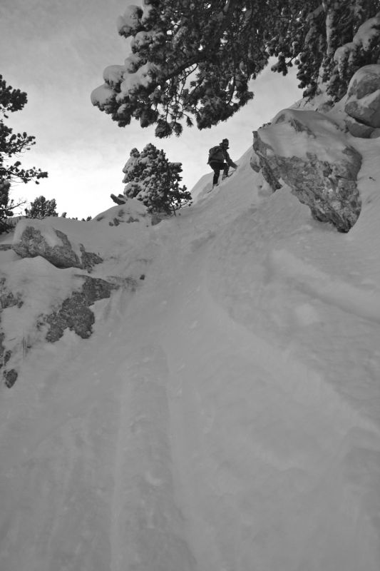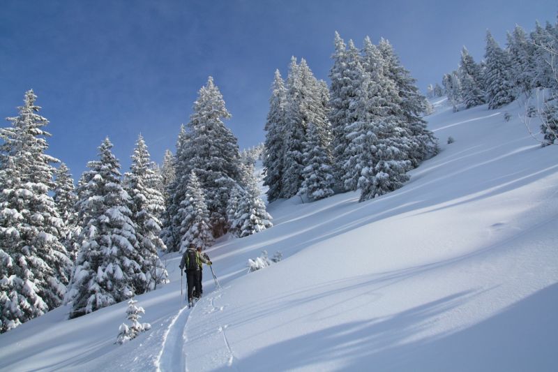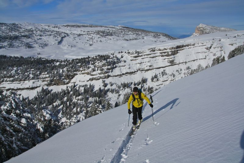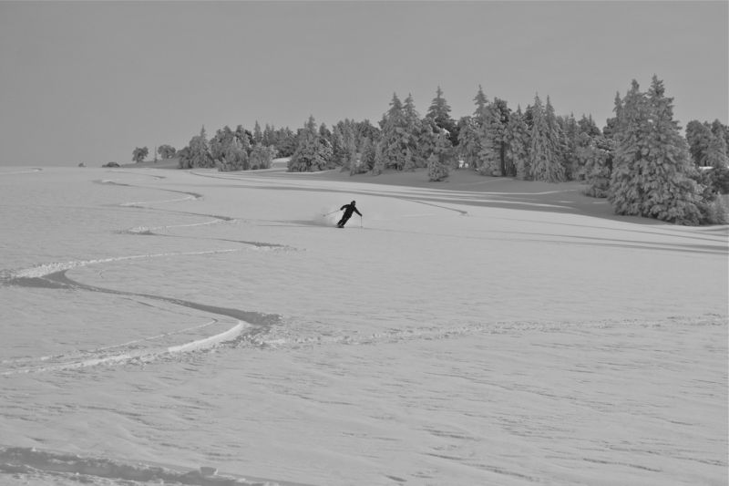 La neige a commencé à chauffer en orientations SE et S. Poudreuse sans cohésion ailleurs sauf à proximité des crêtes où il faut rester vigilant, les quantités mobilisables pouvant être épaisses. Forêt skiable au-dessus de 1200 sous les feuillus. Entrée du pas de la Rousse en excellentes conditions (escalier puis trace directe et braquage à gauche) ; en revanche, quelques passages gratte-gratte sur les dalles du bas insuffisamment recouvertes.