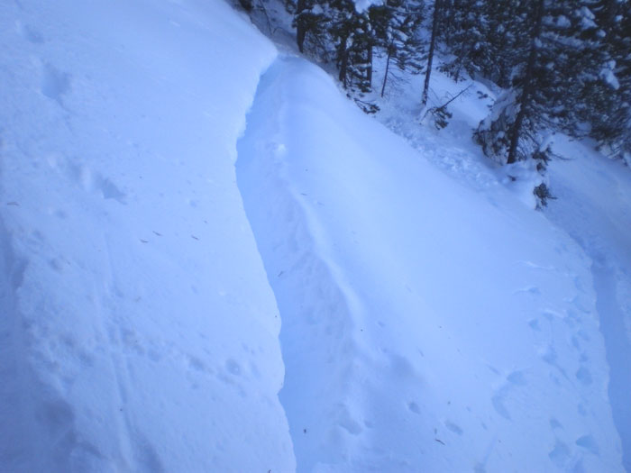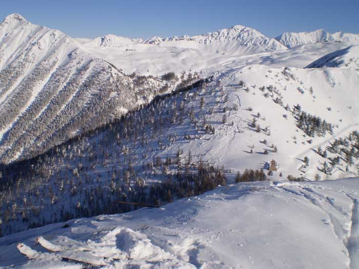 Le risque est de 4 dans la région, et il fallait toute la connaissance du secteur d'Arnaud, Eric et Pierre-Eric pour nous proposer une petite sortie sans trop de tension. Des petits voums par endroits, mais dans l'ensemble le manteau sur cet itinéraire s'est un peu posé. Arnaud pensait nous emmener dans la jolie combe nord du Serre des Violettes, mais elle avait été ravagée par des plaques, nombreuses et amples dans le coin.