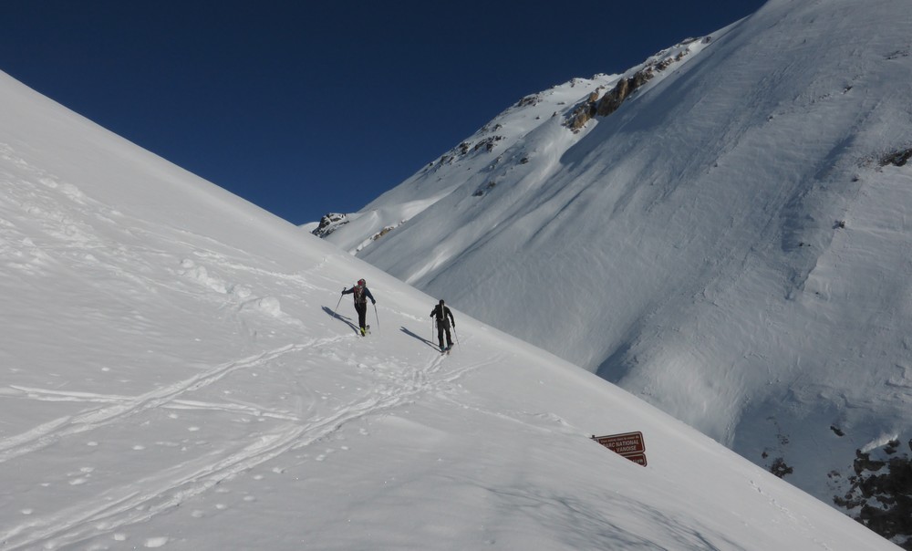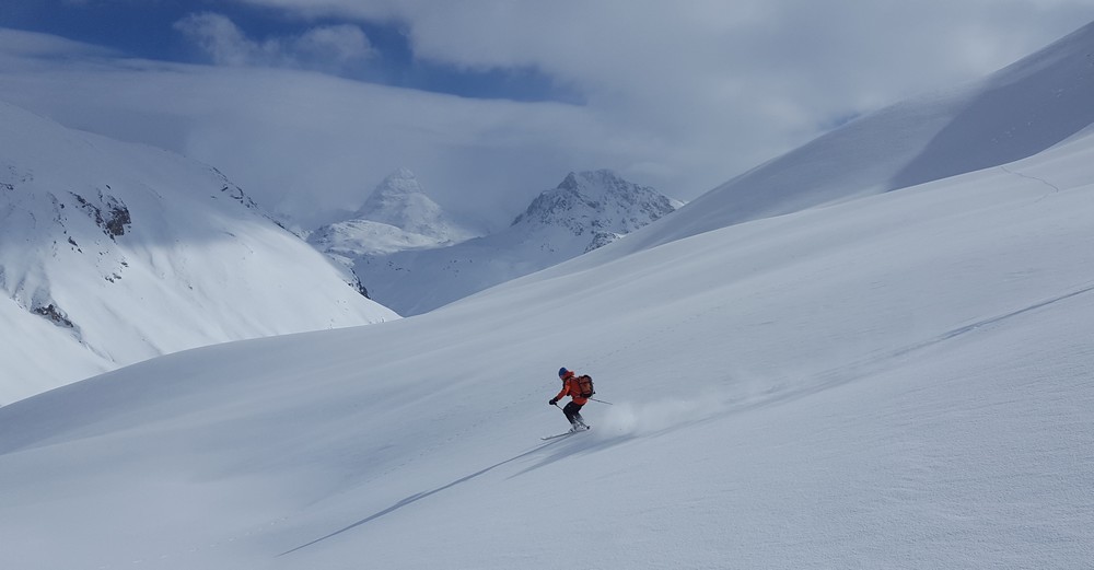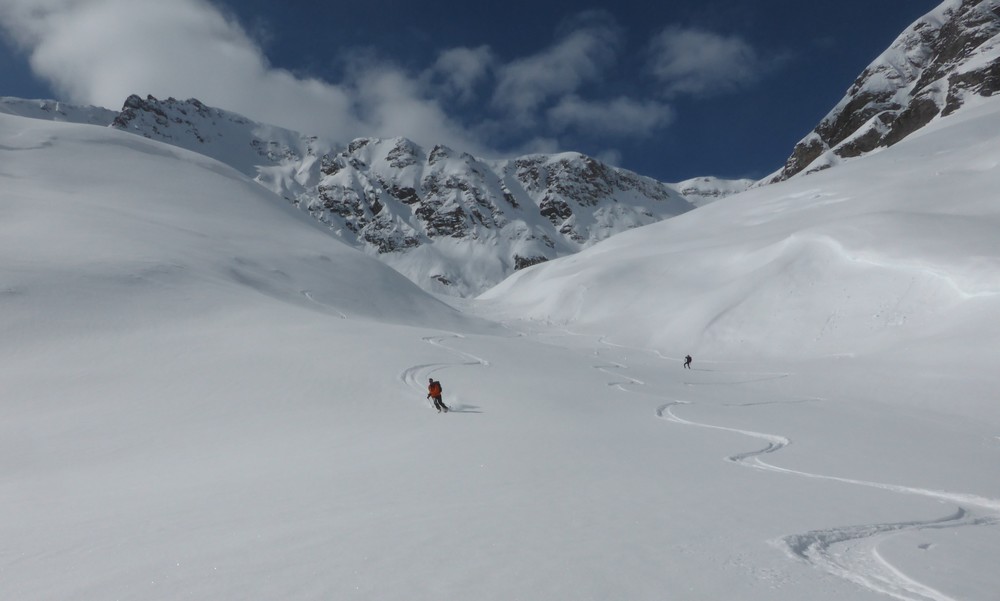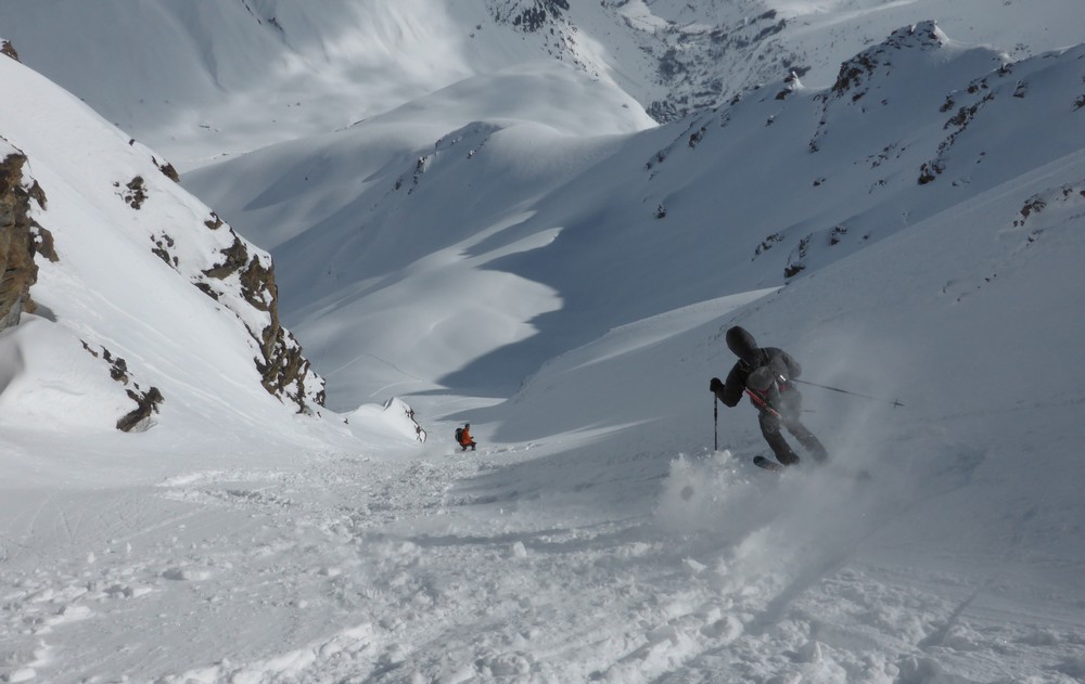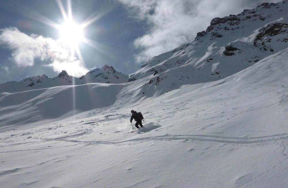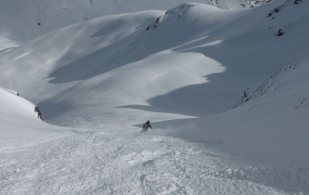 Transfo dans les pentes raides du bas au dessus de Bonneval, ensuite en restant dans les combes, neige peu travaillée par le vent, de 10 à 30 de poudreuse sur un fond tendre (excellent à skier). Couloir poudreux au parfois cartonné. Petit plaque de surface dans les zones cartonnées. Dans ces orientations est et nord quelques pentes et bombés raides ont purgé de la chute de neige de dimanche.