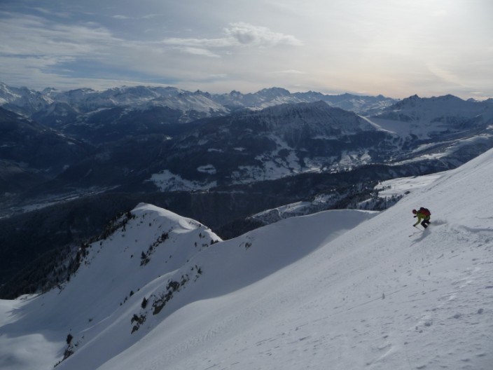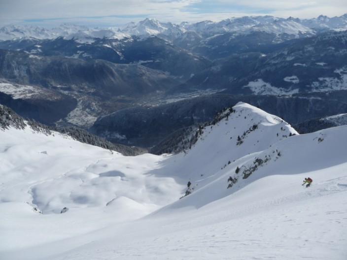 Beaucoup de distance pour aller chercher les Arrangles depuis le Biollay mais une belle récompense à la clé avec toute la pente absolument vierge et une neige fabuleuse. Et puis la bonne surprise de pouvoir descendre le couloir SW et de poursuivre plus faciement dans le vallon d'à coté, malheureusmenent en moins bonnes conditions.