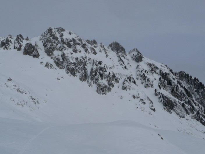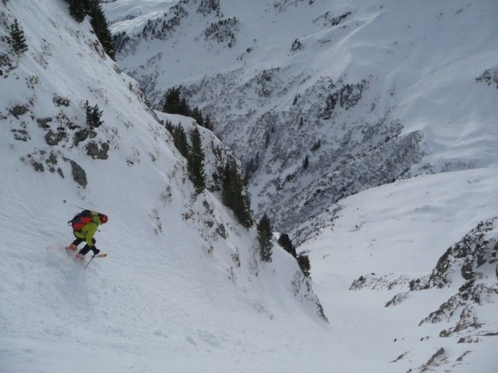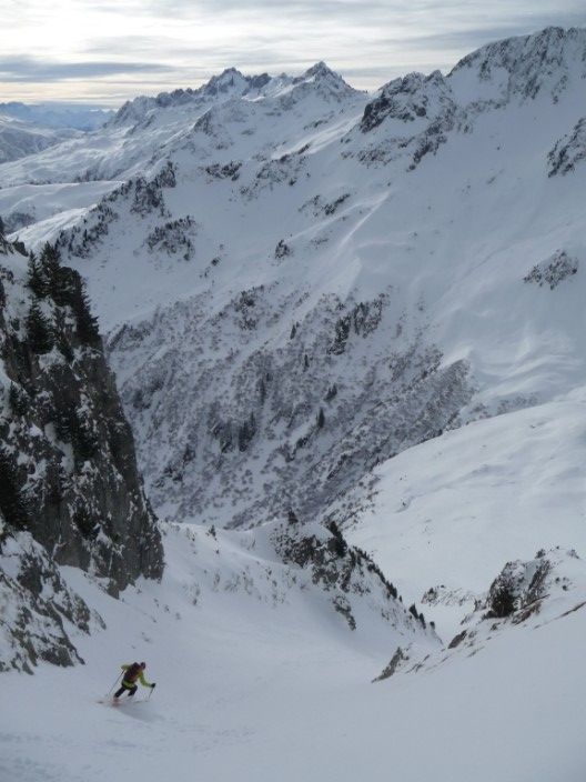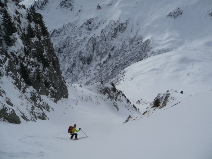 Peu de neige récente dans le secteur, 15cm tout au plus et encore. En est > 1600m, la sous-couche est constituée de neige humide, déjà bien tassée. RAS dans le couloir : peu de meige mobilisable sur un fond parfois glacée mais bon grip. Travail du vent beaucoup plus visible dans marmottes noires que arrangles