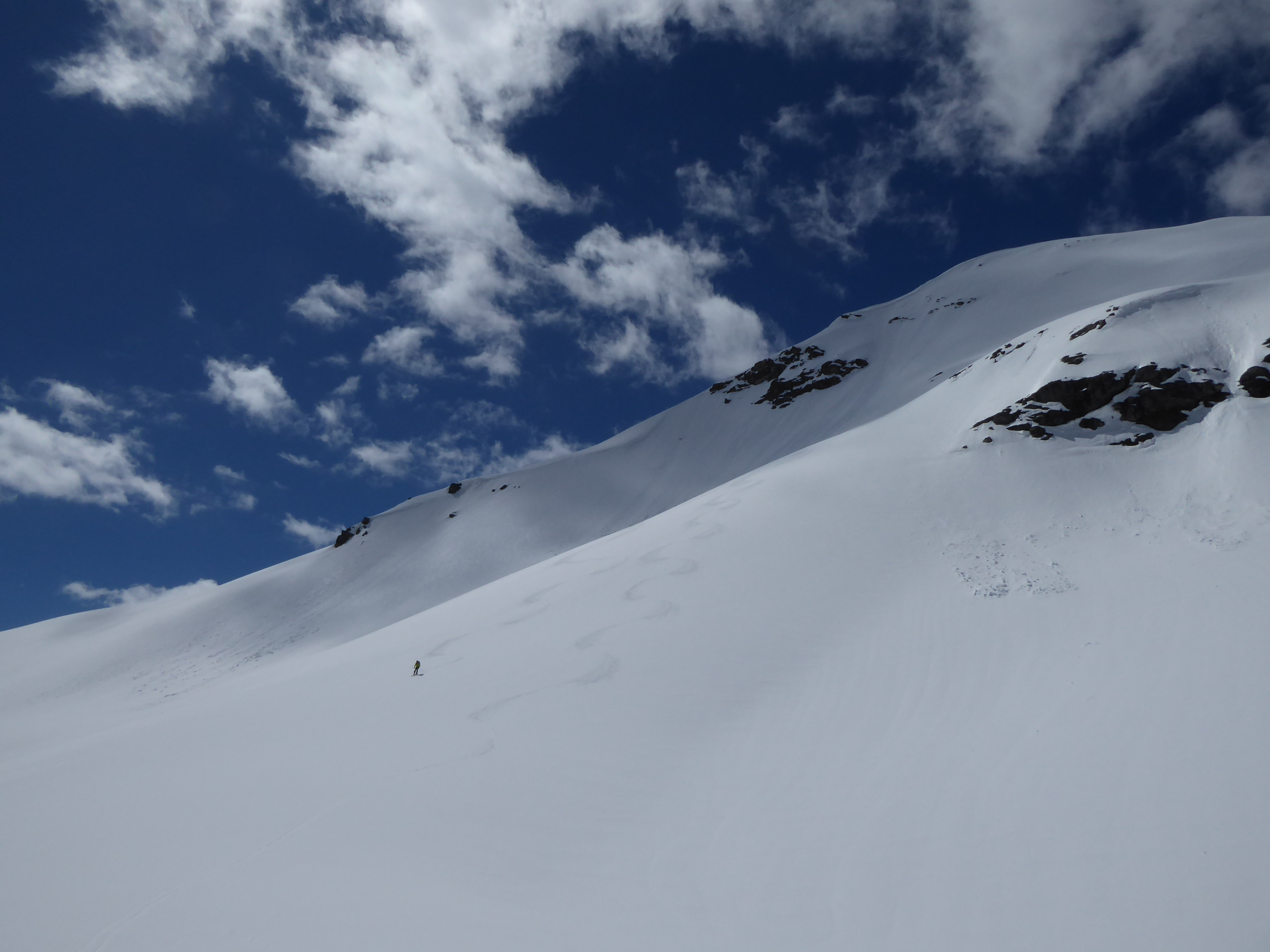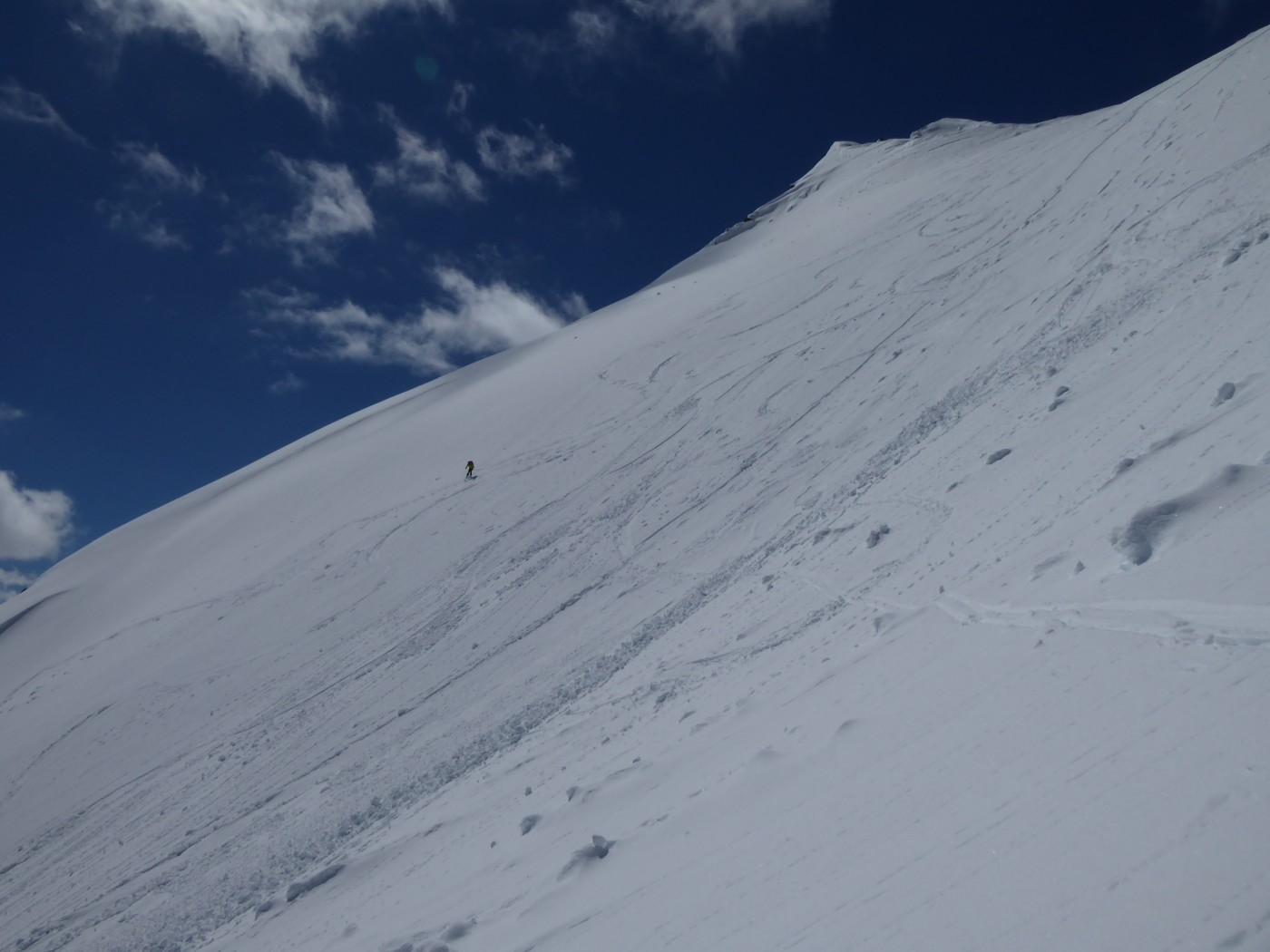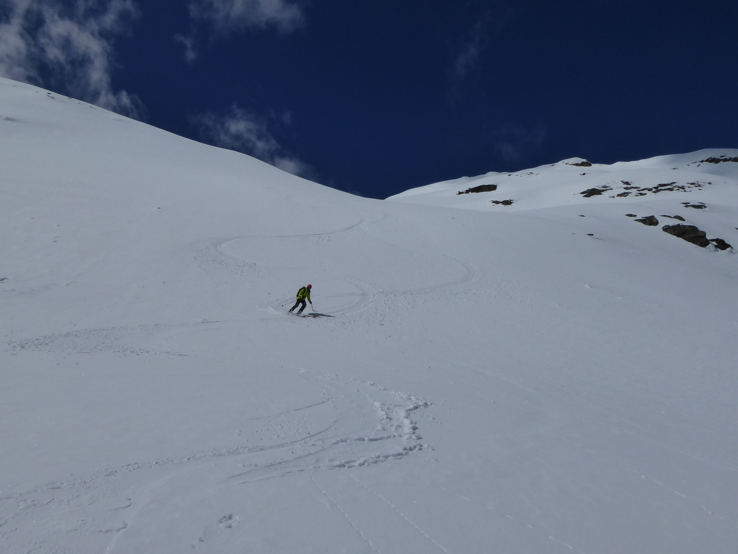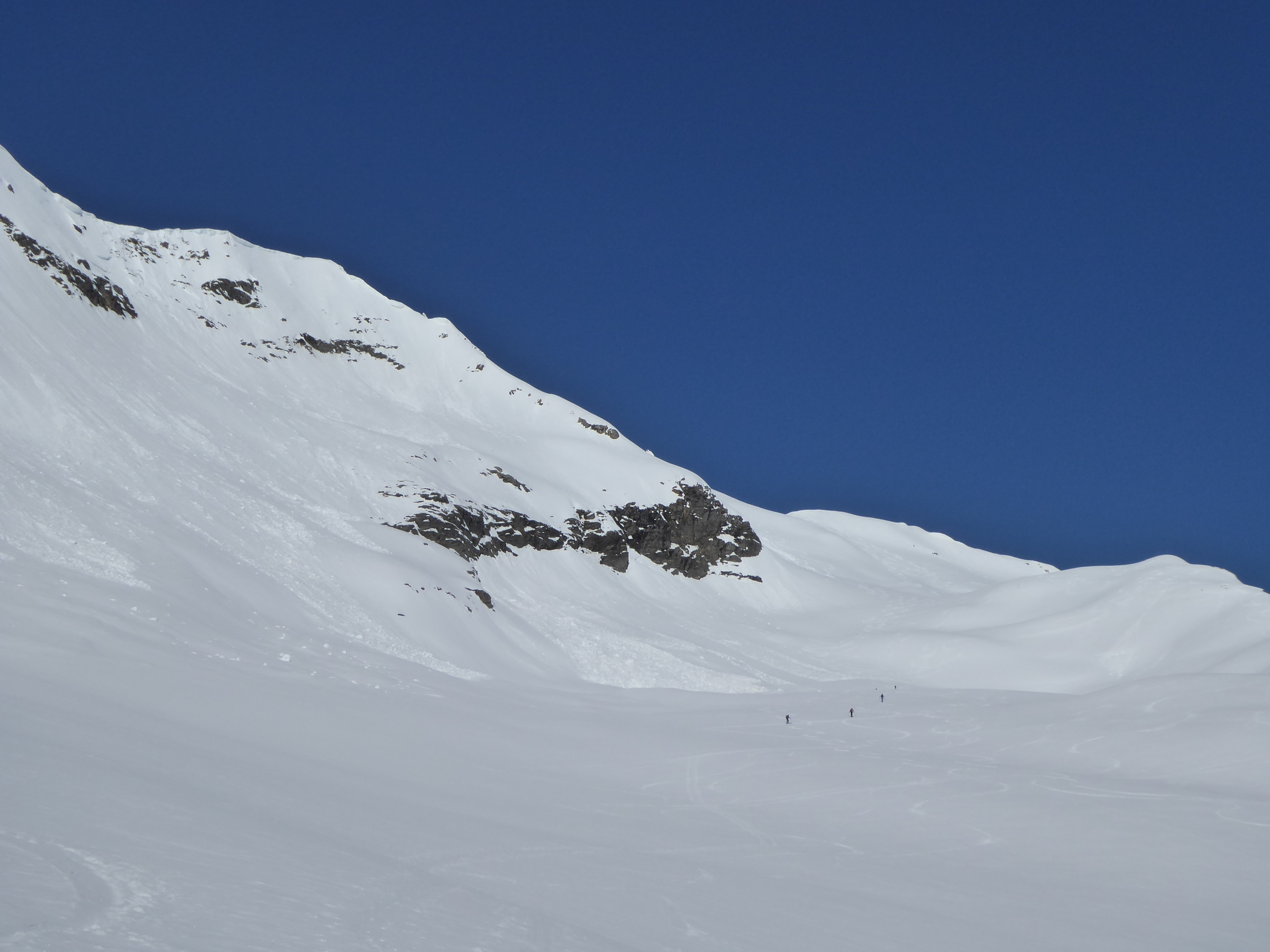 Bon enneigement au-dessus de 2000. Regel correct (portant) mais ça chauffe vite. Il aurait fallu descendre avant 10h. A 11h de petites coulées partaient sous les ski dans les pentes raides E à NE.