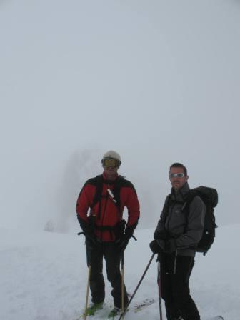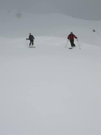 Vu la charge en neige fraiche de ces derniers jours, et la météo franchement maussade (jour blanc, neige, brouillard ...) on a abandonné l'option Jasse et ses pentes terminales pour, dès le verrou des lacs du Vénétier atteint, prendre plein N pour accéder à la longue arête Jasse Bedina, à peaux, avec un court déchaussage brassage. Bon, en terme de pentes, on n'a pas fait (je n'ai pas fait) un très bon choix car c'est au moins aussi raide que La Jasse, mais bcp moins long et expo (d'un point de vue nivologie) ...