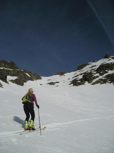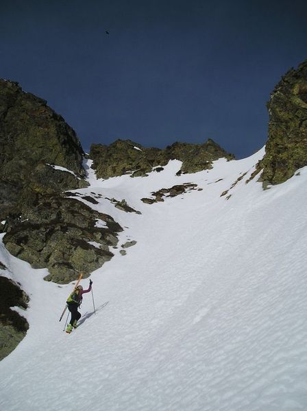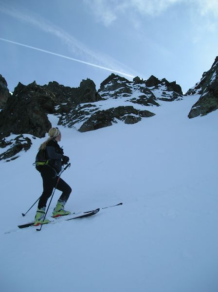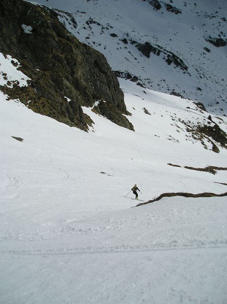 On a suivi C18 jusque vers 1900m puis attirées par les belles pentes descendant des arêtes de Bédina, on s'est engagé dans le couloir sud-est. Descente idem => 2000m puis remontée au collu au nord de la Dent de Bédina, descente en nord-ouest jusque vers 2100m. Dernière remontée aux arêtes par un petit couloir à proximité du Jas des Lièvres. Descente quasi idem à la 1ère.